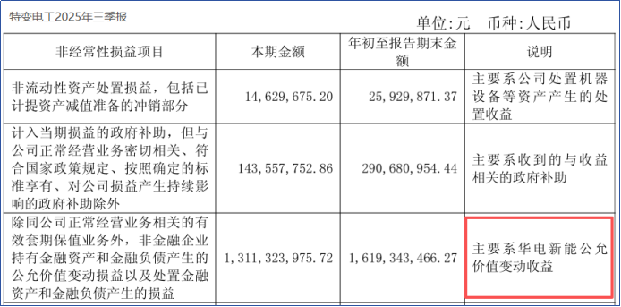 特变电工当期实现净利润54.84亿元,一反此前颓废状态,同比增速达到27.55%。公司此次业绩增长,主要是受华电新能公允价值变动收益影响,因为另一半,同期公司扣非净利润增速为-3.41%。