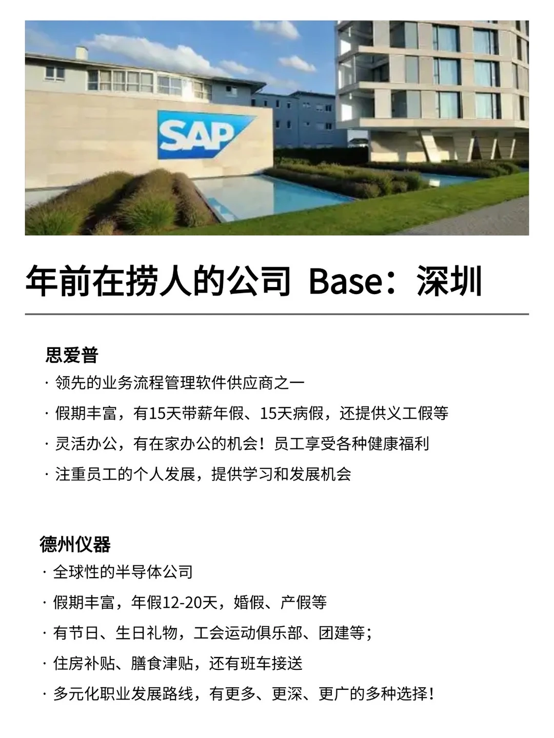 深圳发展真的越来越好,有不少小而美、冷门宝藏的公司,机会是真的很多的! 特别是有不少小众冷门的外企,真心建议大家可以去试试 · 为什么还是值得去外企? ▪️氛围好,对女性友好,年假长,基本上都是10天起步 ▪️很多还都支持居家办公、福利完善,是真的能实现WLB ▪️待遇也还不错,想在年前找工作的真的可以考虑考虑~ · 坚持日更✊🏻,帮大家在找工作路上顺利拿 offer! ·