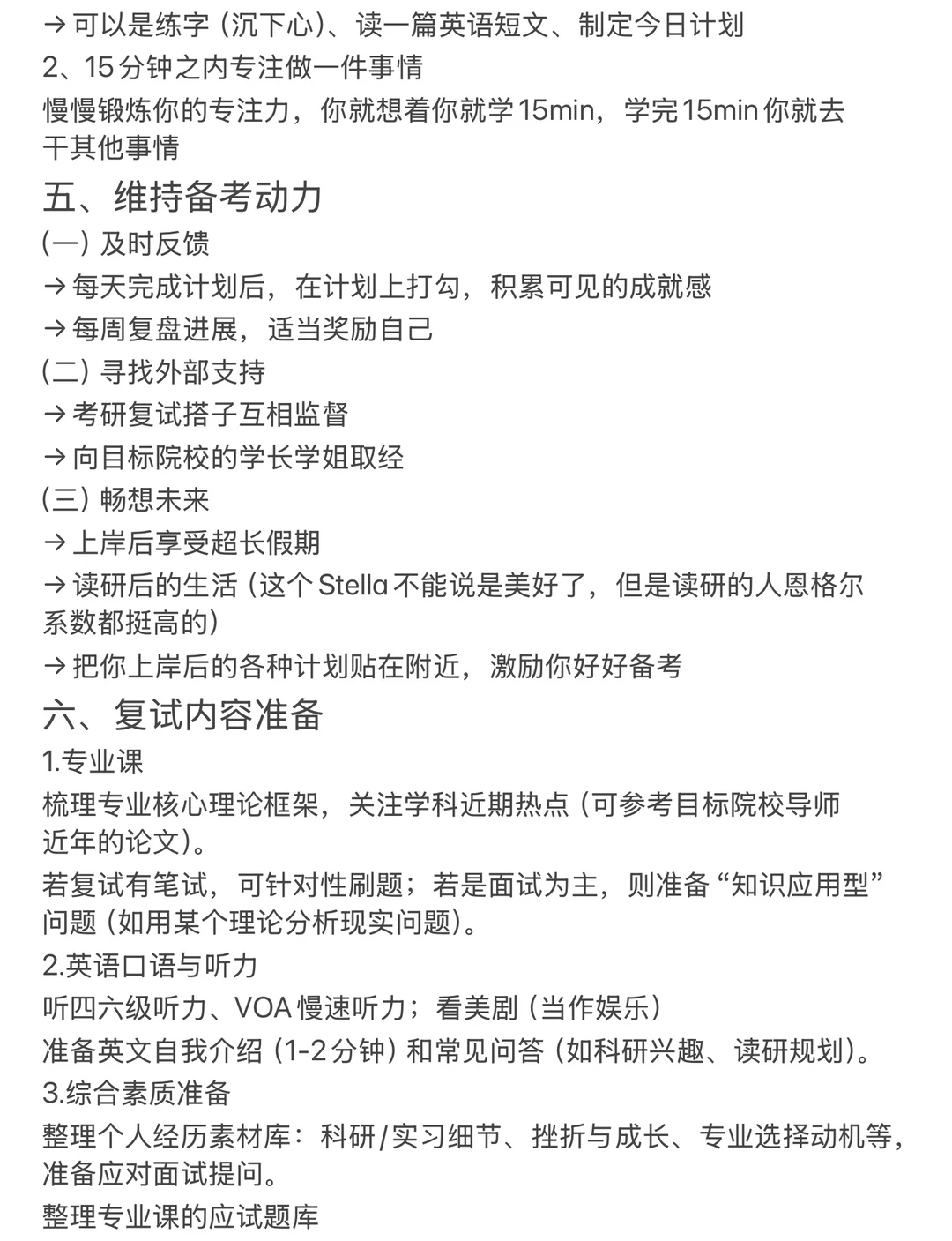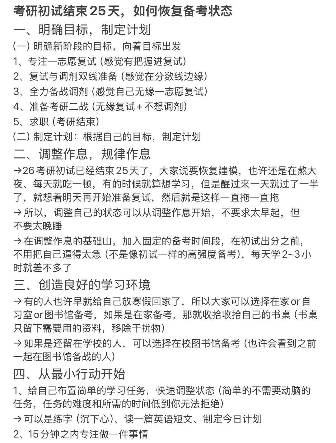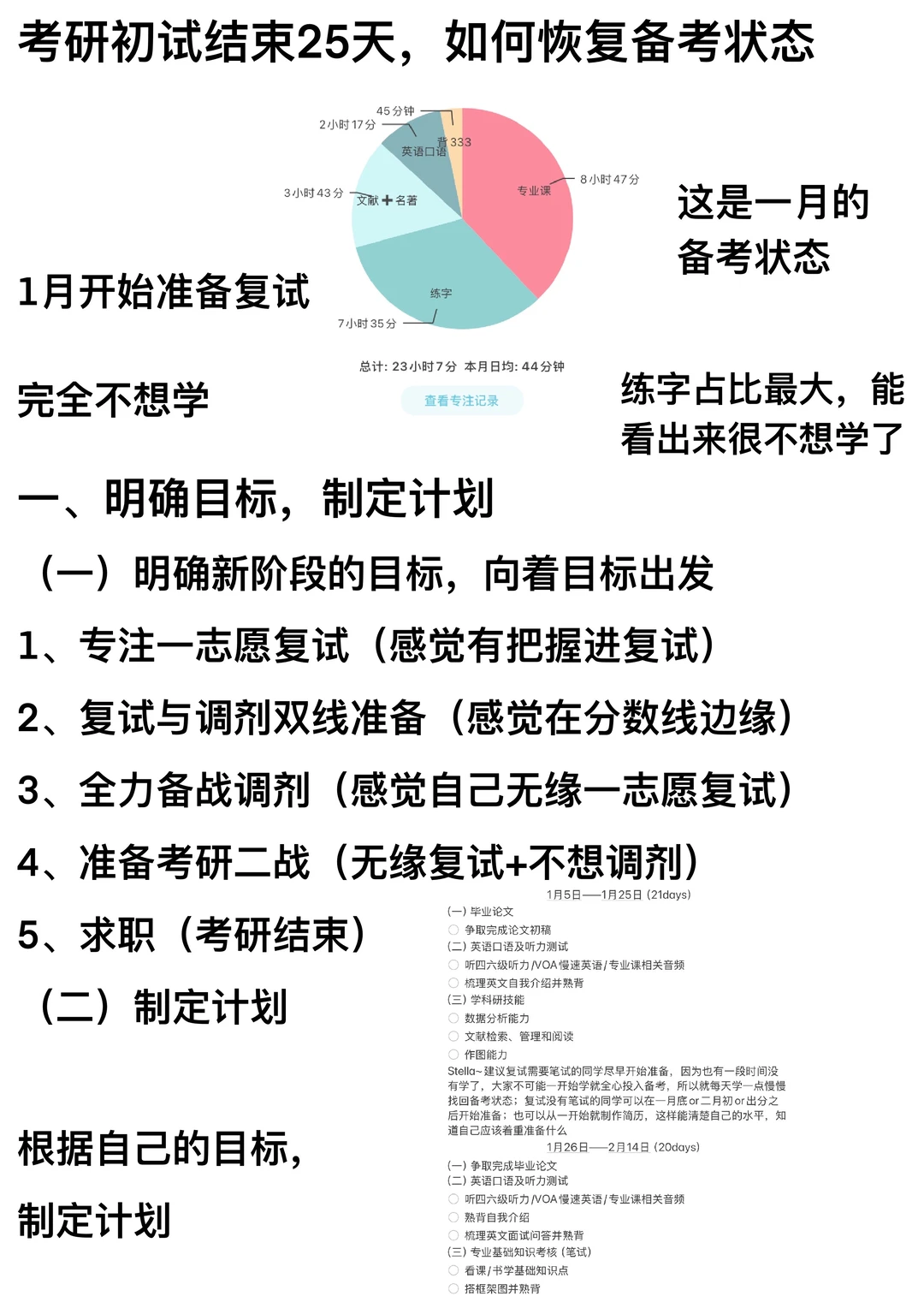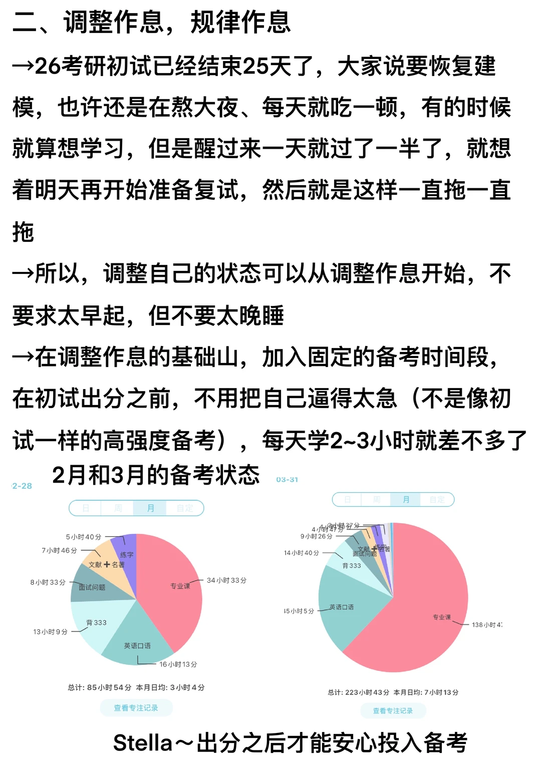 →在调整作息的基础山,加入固定的备考时间段,在初试出分之前,不用把自己逼得太急(不是像初试一样的高强度备考),每天学2~3小时就差不多了