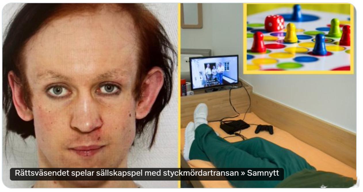 《快报》:2025年12月26日晚,一名假扮成女性并自称“维尔玛”·安德森的瑞典男子涉嫌绑架并杀害了一名25岁女子,随后将其肢解。他在斯德哥尔摩南部的一片森林中埋葬尸体时被捕。他目前被关押在瑞典国家法医医学委员会的设施内,该设施设有两间专门用于进行法医精神病学检查的部门。瑞典法医委员会不仅与他一起玩棋盘游戏,还为他安排了一个专门的房间,拥有独立的电视房、PlayStation游戏机以及书籍。他还拥有自己的厨房和阳台。这是因为他“在媒体上有名”,因此有被其他囚犯欺凌的风险。看见了吧?这就是中国某些法学专家和学者从西方学回来的“文明先进”的司法体系,他们喜欢与罪犯共情、与吸毒者共情、与非法移民共情、与精神病共情......就是不喜欢与最广大普通守法公民共情。