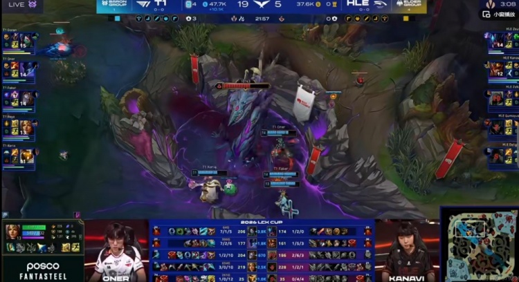 [21:30]上路Doran阿卡丽一打二强杀Kanavi皇子,T1大龙逼团,Oner梦魇开飞再抓掉Gumayusi烬,Keria巴德大招留人,T1再追死HLE中辅,打出0换4之后回头拿下大龙!一万多的经济差了!