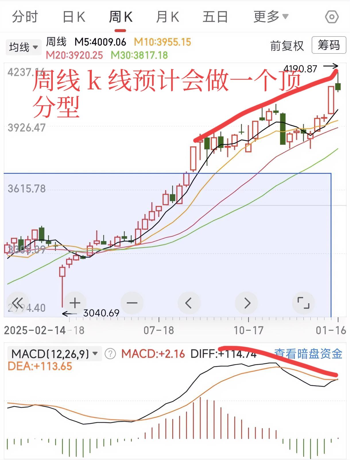 当前大盘指数已触及前期预期的4190点附近。从技术结构看,月线级别多头趋势依然保持完好,长期预计将延续震荡上行格局。指数目前已突破前期高点压制线,并触及月线上行通道上沿,该位置存在技术性调整需求——这与我们此前分析一致。本次调整预期为周线级别,即市场可能进入一个周线规模的盘整阶段。从时间维度看,此类盘整通常持续3-4个月,形态可类比2024年10月自3674点至3040点的周线整理过程。 周线层面,MACD顶背离结构正在形成:指数连续创出新高,但MACD快慢线未能同步上行,显示动量放缓。从本周走势推断,下周市场可能出现加速回调,周K线大概率形成顶分型结构,从而确认周线级别调整的开始。 综上所述,市场长期趋势仍偏向积极,但中短期将面临周线规模的技术修整。我们在保持战略多头思维的同时,需注意波动加剧带来的节奏变化。