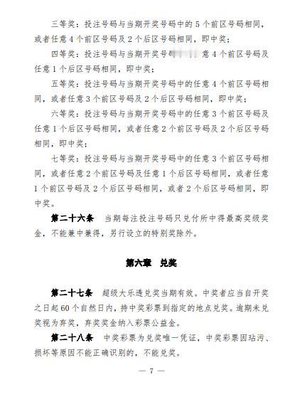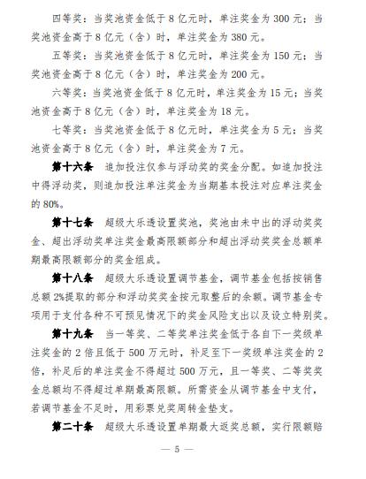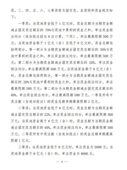 体彩大乐透游戏规则迎来全面调整,力度空前,详细解析如下: 一、奖项层级优化: 由原来的九个奖项整合为七个奖项,具体合并情况如下: 原三等奖(5+0)与四等奖(4+2)合并,统一为新的三等奖; 原六等奖(3+2)与七等奖(4+0)合并,统一为新的五等奖。 二、奖金分配规则调整: 一等奖与二等奖:单期奖金总额(含追. 加投注)封顶限额调整为最高1亿元。 二等奖:当奖池高于8亿元时,总奖金为当期奖金总额扣除固定奖后的40%。 三至七等奖:奖金设置与奖池水位挂钩,具体如下: 三等奖:奖池低于8亿元时,单注奖金5000元;高于8亿元时,单注奖金6666元(原为固定3000或10000元)。 四等奖:奖池低于8亿元时,单注奖金300元;高于8亿元时,单注奖金380元(原为固定300元)。 五等奖:奖池低于8亿元时,单注奖金150元;高于8亿元时,单注奖金200元(原为固定100或200元)。 六等奖:奖池低于8亿元时,单注奖金15元;高于8亿元时,单注奖金18元(原为固定15元)。 七等奖:奖池低于8亿元时,单注奖金5元;高于8亿元时,单注奖金7元(原为固定5元)。 此次调整不仅涉及奖项合并,更重构了奖金分配机制,调整幅度较双色球更为显著。一方面,高额大奖的限额可能使部分头奖奖金有所收窄;另一方面,中小奖项的奖金普遍提升,惠及面更广。规则变化既体现了奖池动态联动的新思路,也平衡了大奖与小奖之间的利益格局。 各位彩民朋友,对于此次大乐透规则的全新调整,你们有何见解?欢迎畅谈!