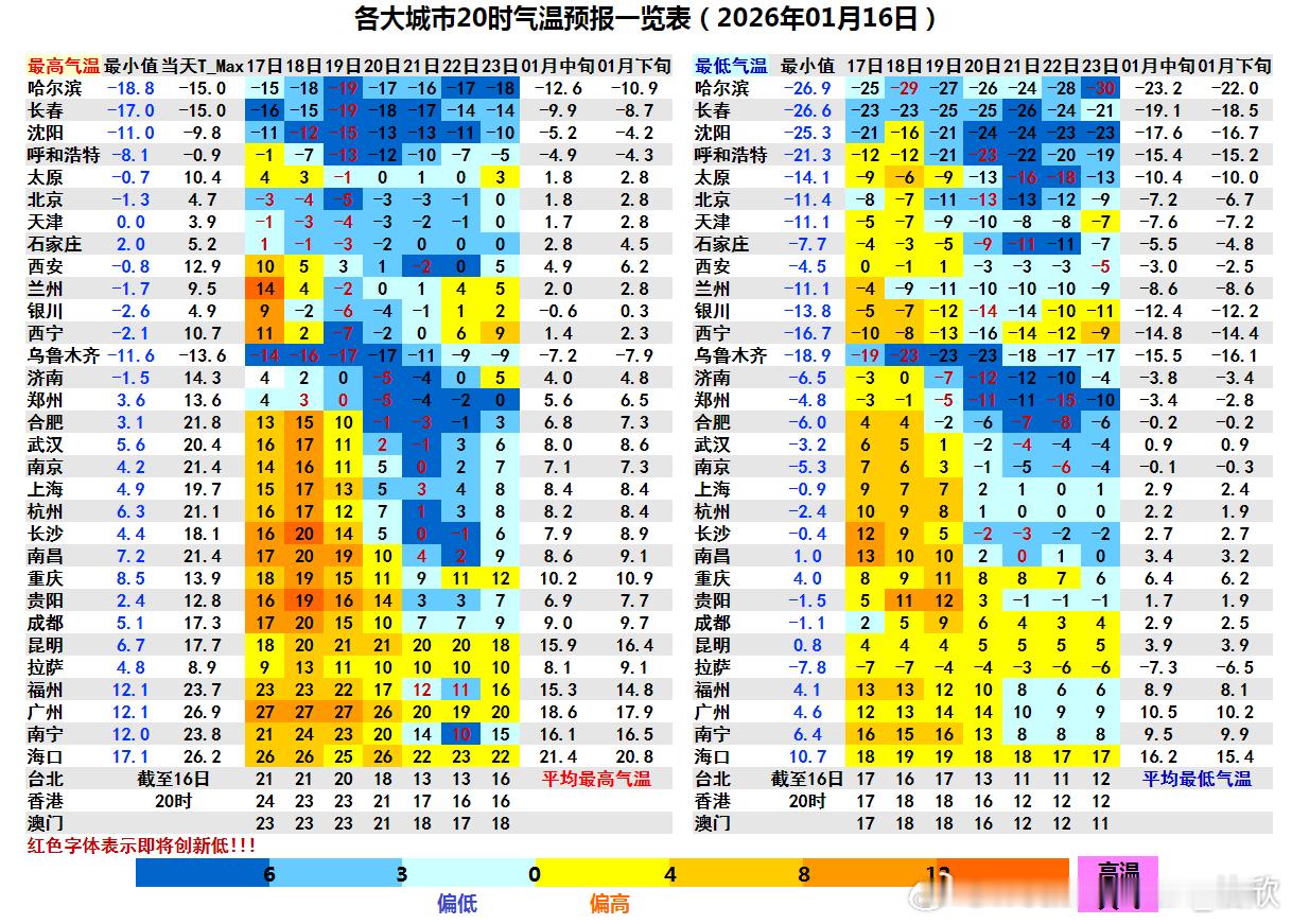 【寒潮预警 气温大逆转】今晚中央气象台发布了寒潮蓝色预警。这轮寒潮将改变近期天气大暖的格局,导致多地气温创立冬后新低,这个冬天最冷的日子即将到来。而且因为高空横槽没有完全转竖,冷空气不是爆发南下,而是细水长流的渗透南下,降温后,后续不断有冷空气补充,导致连续多日气温偏低。从寒潮的影响进程看,东路有个先遣团,已经渗透南下,今晚到明天,影响东北华北黄淮长江中下游,西北侧上游的冷空气主体未来不断东移南下,明天主要影响新疆、甘肃西部和内蒙古西部。后天降温核心区在甘肃中东部、宁夏、内蒙古河套一带。19-20日强降温区将转到长江中下游和江南等地,21日对华南也有影响。总体来看,这轮降温过程,安徽河南湖北湖南贵州一带可能是核心降温区。而且因为之前是晴天+南风升温,之后是雨雪+北风降温,光照因素和平流因素,全部倒转,因此最高气温的下降幅度会大于平均气温和最低气温降幅。部分城市可以看到最高气温降幅超20℃的情况。比如今天破了1月最暖纪录的南京,将从21.4℃降至0℃。今天破了1月中旬最高气温气温纪录的合肥,将从21.8℃降至零下3℃。此外、武汉、长沙、也可能从20℃降至零下1℃。华南因为近期气温偏高幅度没有江淮江南明显,降幅看似不是很大,但南宁22日最高10℃,也可能迎来短暂冬日体验。