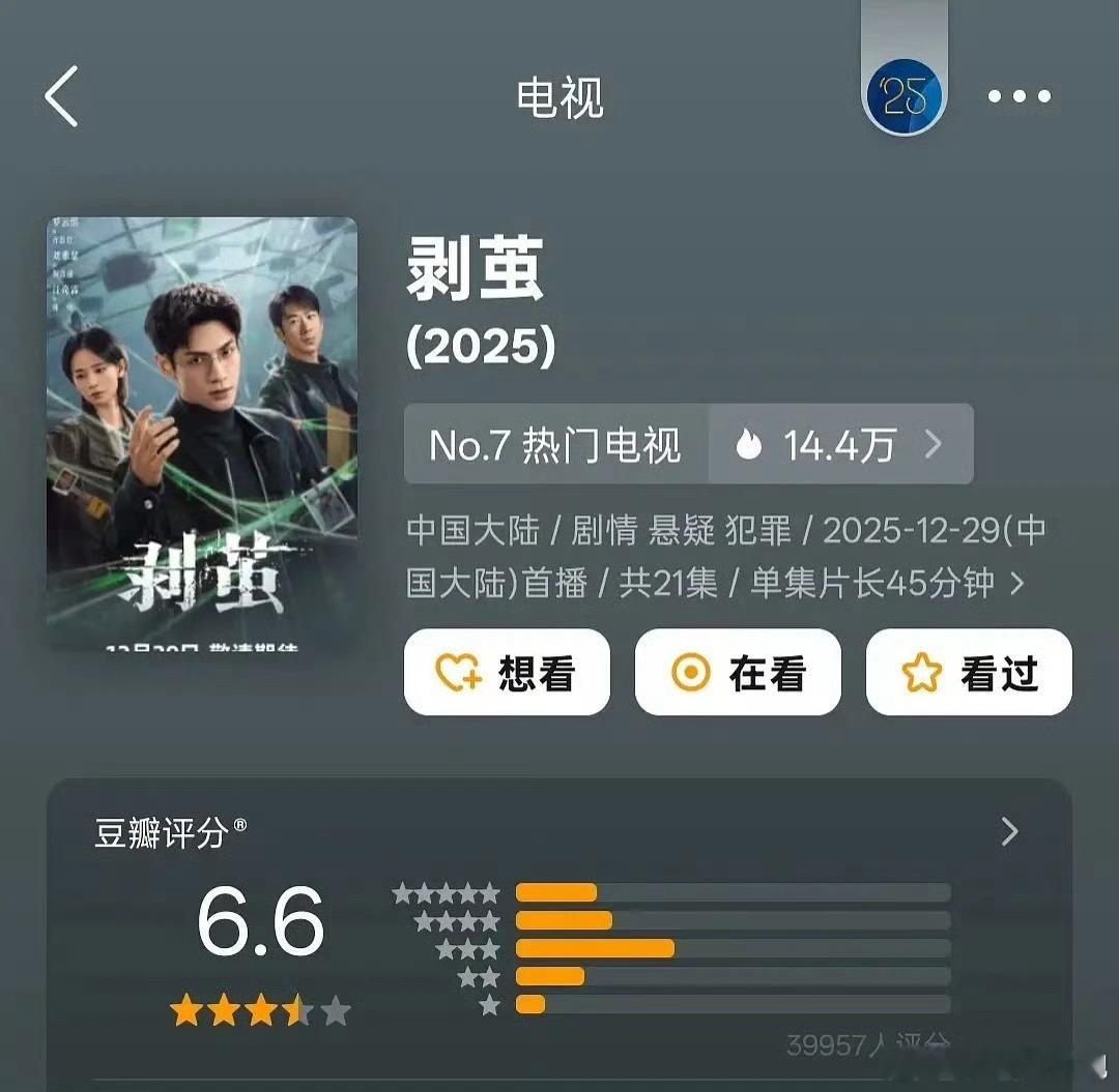 侯明昊、娜扎《玉茗茶骨》豆瓣评分6.8罗云熙《剥茧》豆瓣评分6.6我真觉得这两部分低了,《玉茗茶骨》里荣善宝的成长没有靠男主拯救,自己是执棋者,真的很喜欢这一点《剥茧》剧情节奏紧凑,反转一次又一次,永远猜不透下一步会干什么,真相到底是什么这两部剧都给我很大惊喜,你觉得这个分数高了还是低了?