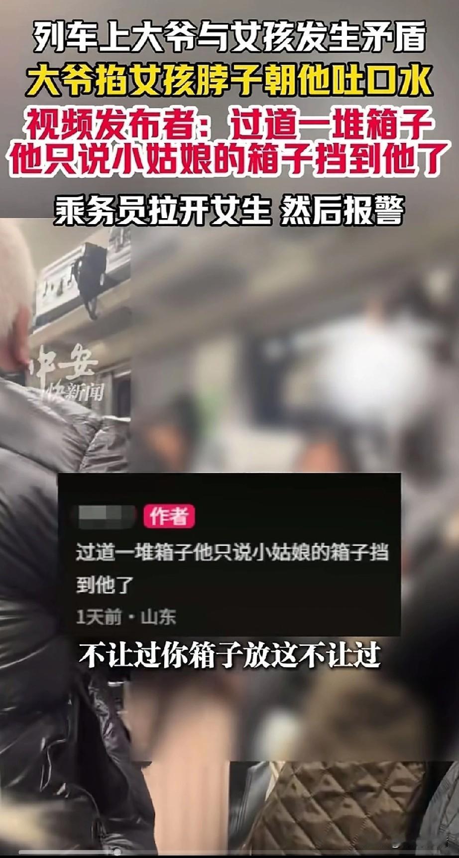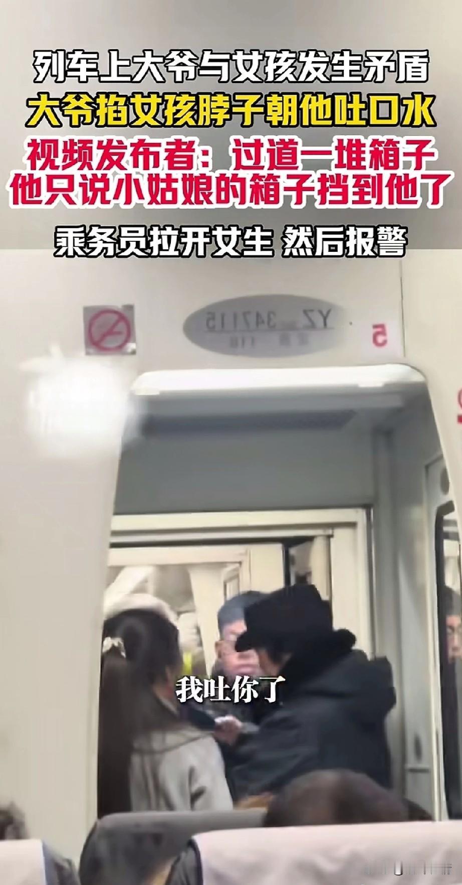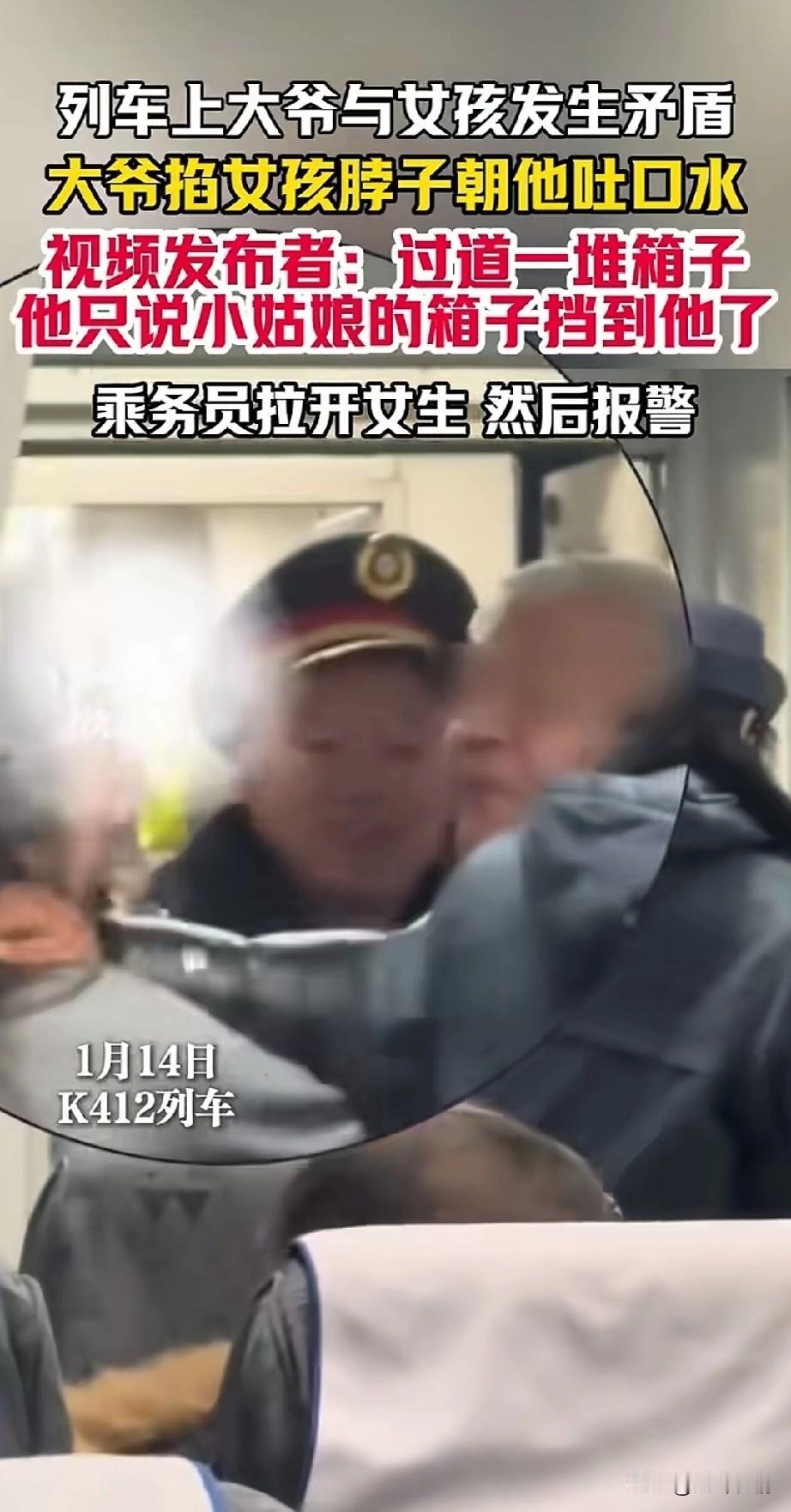 近日K412列车上发生了瞠目结舌的一幕,一名头发花白的大爷掐着一个年轻女子的脖子,向她吐口水,旁边还有列车员进行劝解! 事情原来是这样的,一大爷上车之后,就开始走向自己的座位,但是突然发现前方的狭窄过道被一个行李箱挡住了! 于是他就问这是谁的箱子?挡住道了知道不?语气可能有些生硬!他也没想到这话会激动旁边的女生! 女生可能觉得大爷的听着有点儿刺耳,于是表示这是自己的箱子,但是就是不让动! 大爷也是个急脾气,就对女孩吼道你不知道自己的箱子挡住路了吗?赶紧挪开! 女孩看着大爷的暴脾气,也不惯着大爷,就说我的箱子就在这儿,就是不让过,你能怎么着? 就这一句话,彻底激怒了大爷,大爷上去直接掐住女孩的脖子,把她按在了过道上。 大爷可能平时也是蛮横惯,毕竟年龄大了,没人敢动,女孩也是被家人惯坏,觉得没有人敢打自己! 结果这两个人撞在了一起,就发生了现在的一幕,只见大爷掐着她的脖子,将她按在了车厢交界处, 女孩也不怕,嘴里还在叫嚣,你敢打我吗?大爷也是在喊我不打你,打你干啥?我吐你! 说完后就将口水吐在了女孩的脸上,女孩也是由于躲闪不及,脸上沾染了大爷的口水,两个人的动作有些滑稽! 吸引了列车上的乘客大量围观,大家看着这一幕惊呆了,都没想到大爷居然小女孩吐口水,可能连女孩都没有想到! 两个人吵吵的时候就惊动了列车员,不过列车员也不敢强行将大爷拉开,只能在旁边劝解大爷不要冲动! 在大爷发泄完之后,列车员才把女生拉开,随后报了警,不过大爷应该没事儿,毕竟年龄大了,还没有动手!顶多赔礼道歉,和解! 还真是两个活宝撞一块了,女生蛮横不讲理,大爷出奇招恶心女生,还真是打不相识? 大家对于列车上发生的这一幕怎么看? 在火车上的难忘经历都有哪些 你在火车上见到过哪些奇葩 铁路列车