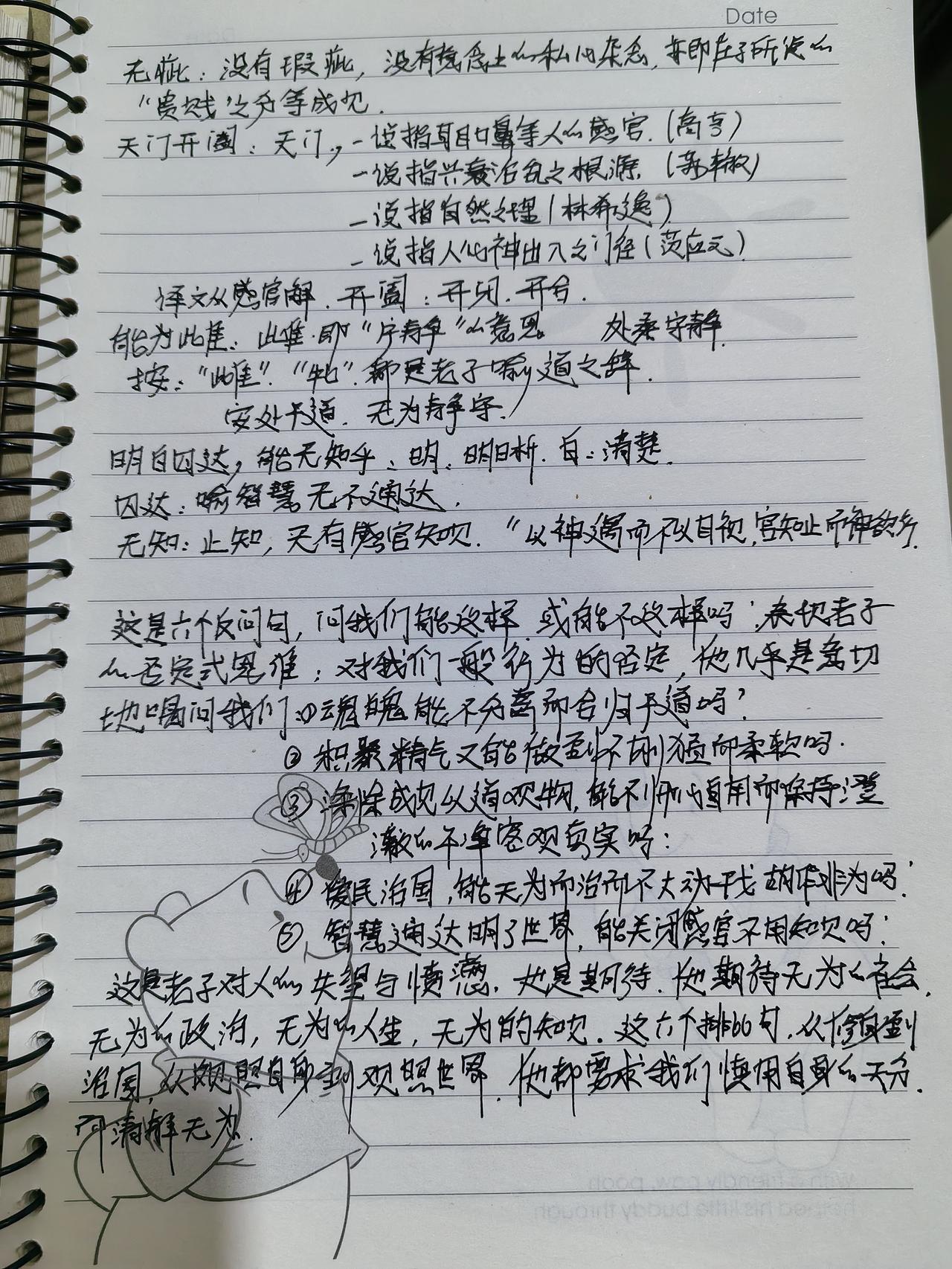 继续研习《道德经》第十章“载营魄”。 依据鲍鹏山教授的解读,这是老子在质问我们,能否做到这般或不这般? “载营魄抱一,能无离乎?”意即魂魄能否不分离而归于道呢?魂魄,指的是人的身体与精神,也就是肉体和灵魂合二为一,能永不分离吗? “专气致柔,能如婴儿乎?”意思是积聚精气,能否做到不刚猛而保持柔软呢?通俗来讲,就是精神专注以达柔和之态,能像婴儿一样吗? “涤除玄鉴,能无疵乎?”意为涤除成见,以道观物,能否保持干净客观的真实呢?通俗地说,就是涤除内心杂念以保持心灵清明,能做到不犯错误吗? “爱民治国,能无为乎?”指的是爱民治国,能否无为而治,不大动干戈呢?通俗来讲,就是爱护百姓、治理国家,大概不应使用巧智吧? “天门开阖,能无疵乎?”意思是智慧通达、明了世界,能否关闭感官、不用知见呢?通俗而言,就是说话做事时,能始终保持安静柔和的状态吗? “明白四达,能无知乎?”是说对事物本质洞悉透彻、通晓四方、明白事理后,能否顺应自然,不主观妄为,不炫耀聪明,不执着于知识表象呢?通俗来讲,即便拥有一切智慧,能做到不四处炫耀吗? 老子主张人的精神与“道”合二为一,如同婴儿一般。婴儿最为天真、最为精纯,最接近于“道”,具备精气十足且十分柔弱的特点。我们成年人若能做到涤除玄鉴、天门开阖,便能如婴儿一样。道德经 道德经真谛 正能量道德经 道德经心得体会 道德经阅后感言 春秋之道德经 道德经品读