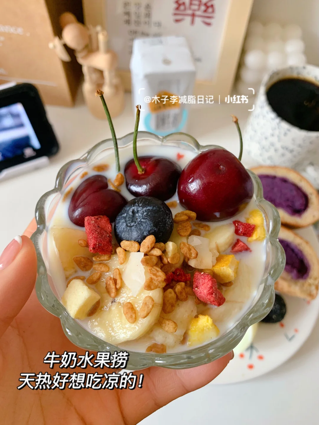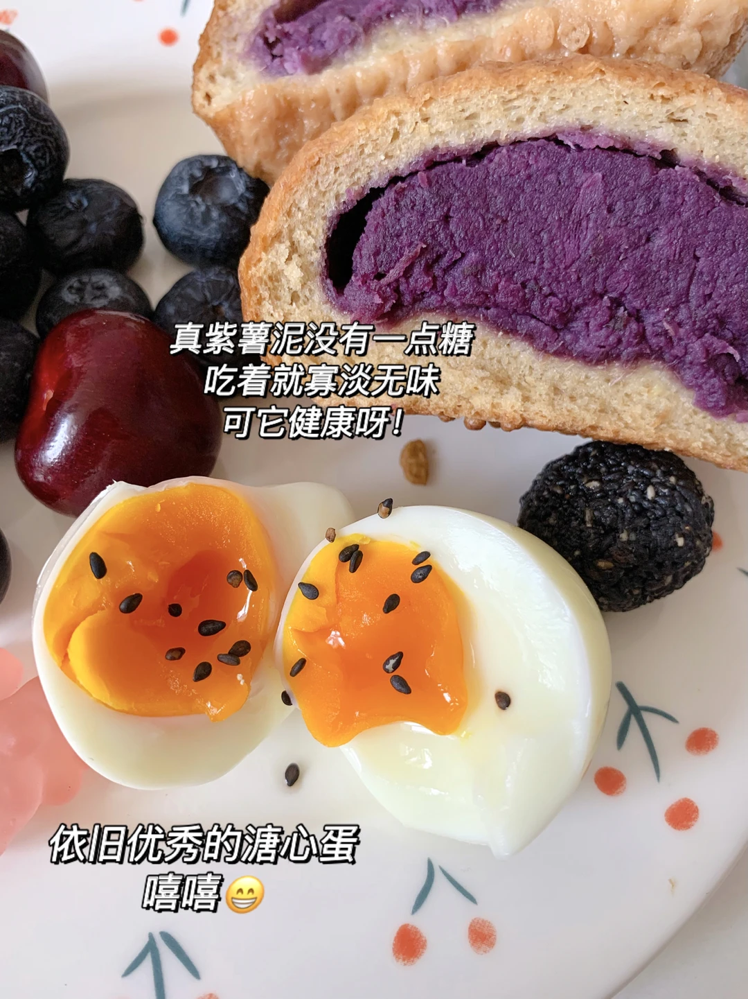 🍳早餐:全麦紫薯面包➕鸡蛋➕益生菌➕樱桃➕蓝莓➕牛奶杯➕黑咖啡