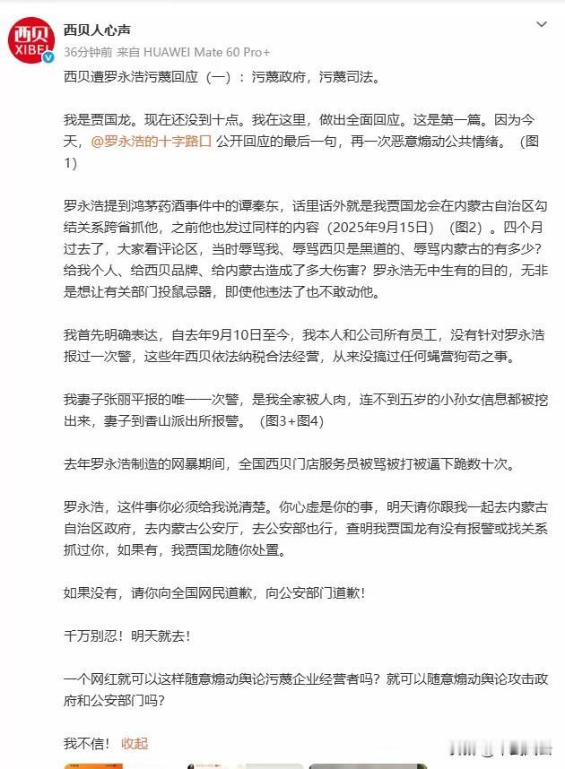 贾国龙这次回应感觉就是无力取闹,先扣帽子 还说要去公安部 ,把内蒙古的政法单位拉上,给自己助威,明明就是底气不足,罗胖如果真的违法了 早被抓了 如果老贾认为老罗违法 应该直接起诉他,而不是在微博征讨,还要别人去内蒙古 不知道西贝新的公关团队是怎么想到这招的,真的垃圾的可以 还不如华与华 。西贝唯一出路就是真诚道歉,并承诺永远不用预制菜。西贝贾老板 老罗西贝大战
