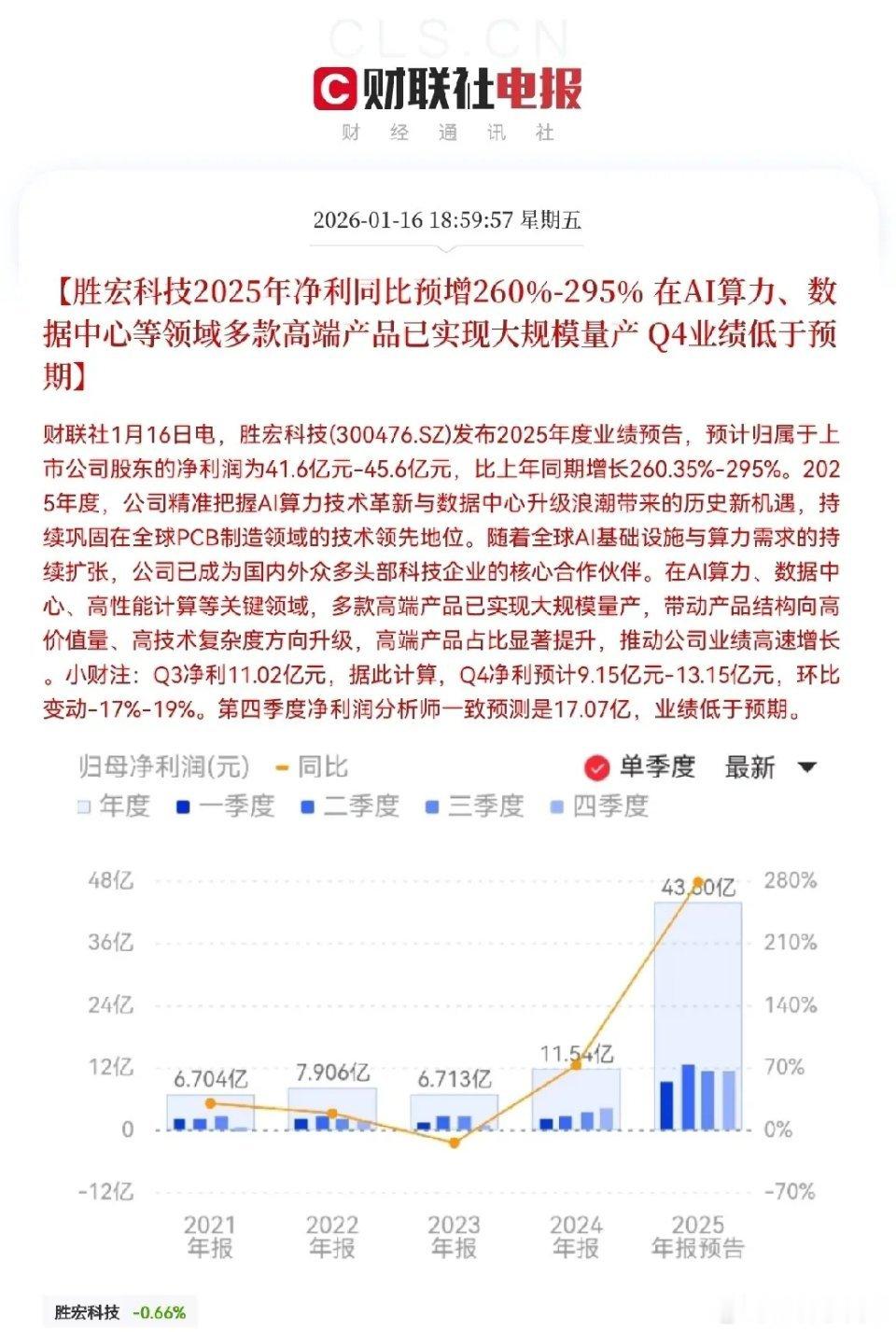 胜宏科技!低于预期!胜宏科技业绩滑铁卢预计下周一胜宏科技要跳空低开了,持有胜宏科技的,恐怕要拍大腿了…晚间6点59分,胜宏科技重磅发布了2025年度业绩预告,全年净利润为41.6亿元-45.6亿元,同比预增260%-295%,Q4净利润预计9.15亿-13.15亿元,环比变动-17%- 19%,第四季度分析师一致预测是17.07亿,业绩低于预期,此业绩预告一出,持有的股民们恐怕笑不出了,此前市场预计第四季度净利润为17亿,全年净利润约50-55亿左右,现在这个业绩明显不及格了,短期对于公司股价来说是一个不小的利空,下周很可能会引发市场失望情绪,导致股价在短期内承压,预计会迎来不小的波动,不过股民们也不要慌,公司长期成长逻辑未变,全球AI服务器对高端PCB的需求旺盛,行业景气度有望延续,胜宏科技作为英伟达等头部客户的核心供应商,技术能力和产能扩张计划仍被看好,中长期依旧值得期待!股民们!坐稳扶好!受此消息影响,预计下周一胜宏科技要跳空低开了,持有的股民们!做好心理准备,有可能要吃面了!