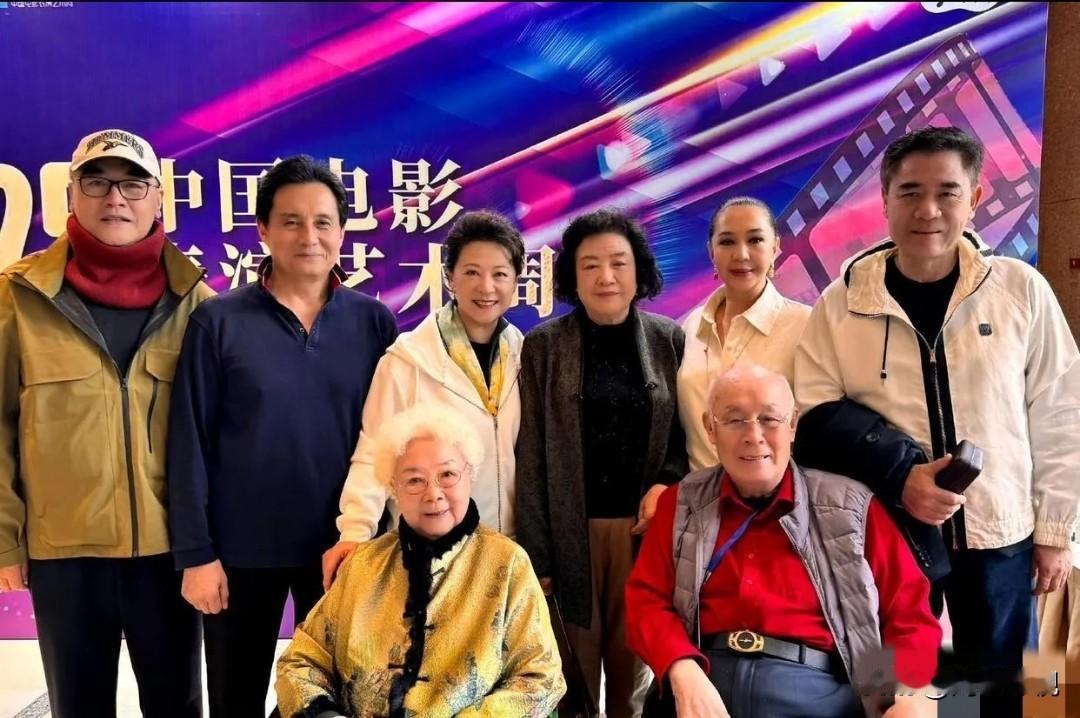 仔细看,前排是表演艺术家田华、许还山,两位虽然年龄大了,头发都白了,但依然红光满面,精神抖擞!后排就认得出疏眉朗目的王伯昭,温婉如莲的王馥荔,目若朗星的陈宝国。而左边戴鸭舌帽围红色围巾的是谁?看他高大修伟,气宇不凡!能与老艺术家田华、许还山一起合影看来不一般!他也是演员吗?有谁认识他?