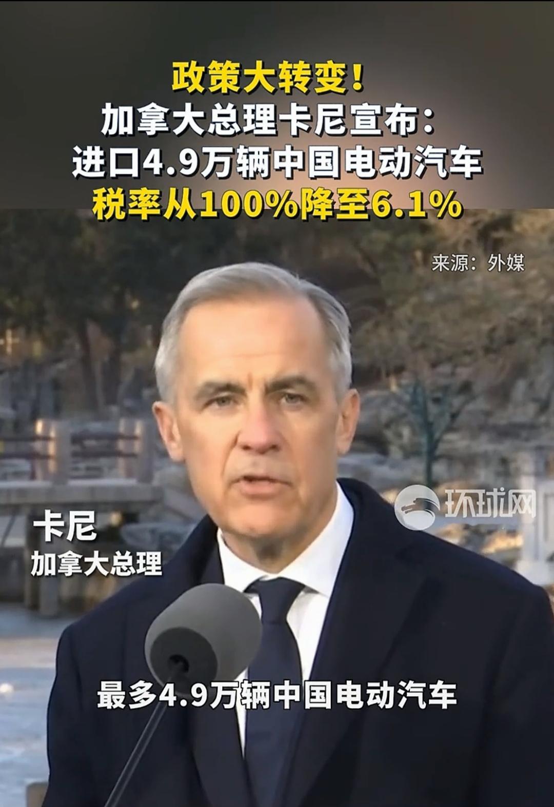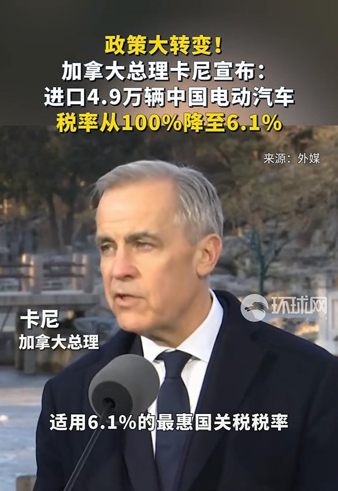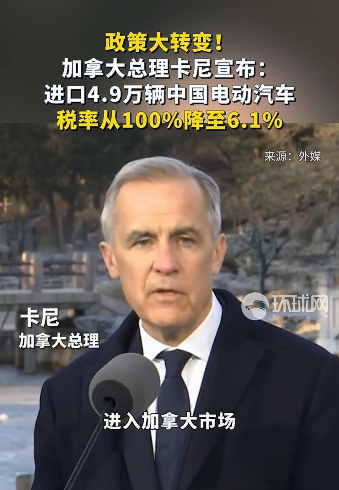 时隔八年,加拿大总理访华,直接宣布中国电动汽车进入加拿大的关税从100%降至6.1%! 时隔8年,加拿大总理卡尼的中国之行抛出重磅信息,1月16日,正在北京访问的卡尼向全球官宣:加拿大将每年允许4.9万辆中国电动汽车以6.1%的最惠国关税进入本土市场,彻底终结2024年以来的贸易限制,这个消息一出,引发全球经贸界关注。 此前在美国压力下,加拿大对中国电动汽车加征100%附加税,让综合税率飙升至106.1%,中国电车对加出口一度陷入停滞。而如今关税“断崖式”回落,4.9万辆配额更精准恢复至贸易摩擦前的出口规模,既彰显中国电车的硬核竞争力,更标志着中加经贸关系迎来实质性破冰。 这一决策背后是市场的理性回归。作为承诺2035年全面禁售燃油车的国家,加拿大2026年新能源汽车销量目标占比达20%,却面临11万辆的市场缺口,本土产能完全无法填补。此前的保护主义政策不仅让消费者被迫承受高价,更导致当地电动车销量暴跌五成,62%的民众支持取消关税,市场刚需倒逼政策转向。 这是一场双赢的合作。中国电车早已凭借领先技术征服了加拿大消费者。比亚迪刀片电池的超长续航适配广袤地理环境,蔚来智能驾驶应对复杂路况,小鹏高性价比车型贴合大众需求。协议还约定五年内半数进口中国电车售价低于3.5万加元,比当地均价低40%,将彻底激活大众消费市场。 既然加拿大带来了大礼包,中国也不能不表示一下,作为对等回应,中国也将下调加拿大油菜籽关税并免除农产品歧视性关税,“电车换农产品”的互补模式破解了双边贸易僵局。 从8年未访到关税大反转,从贸易对抗到产业共建,中加此次合作不仅为中国电车叩开北美主流市场提供了“官方准入证”,更向全球展示了开放合作才是破解发展难题的正道。