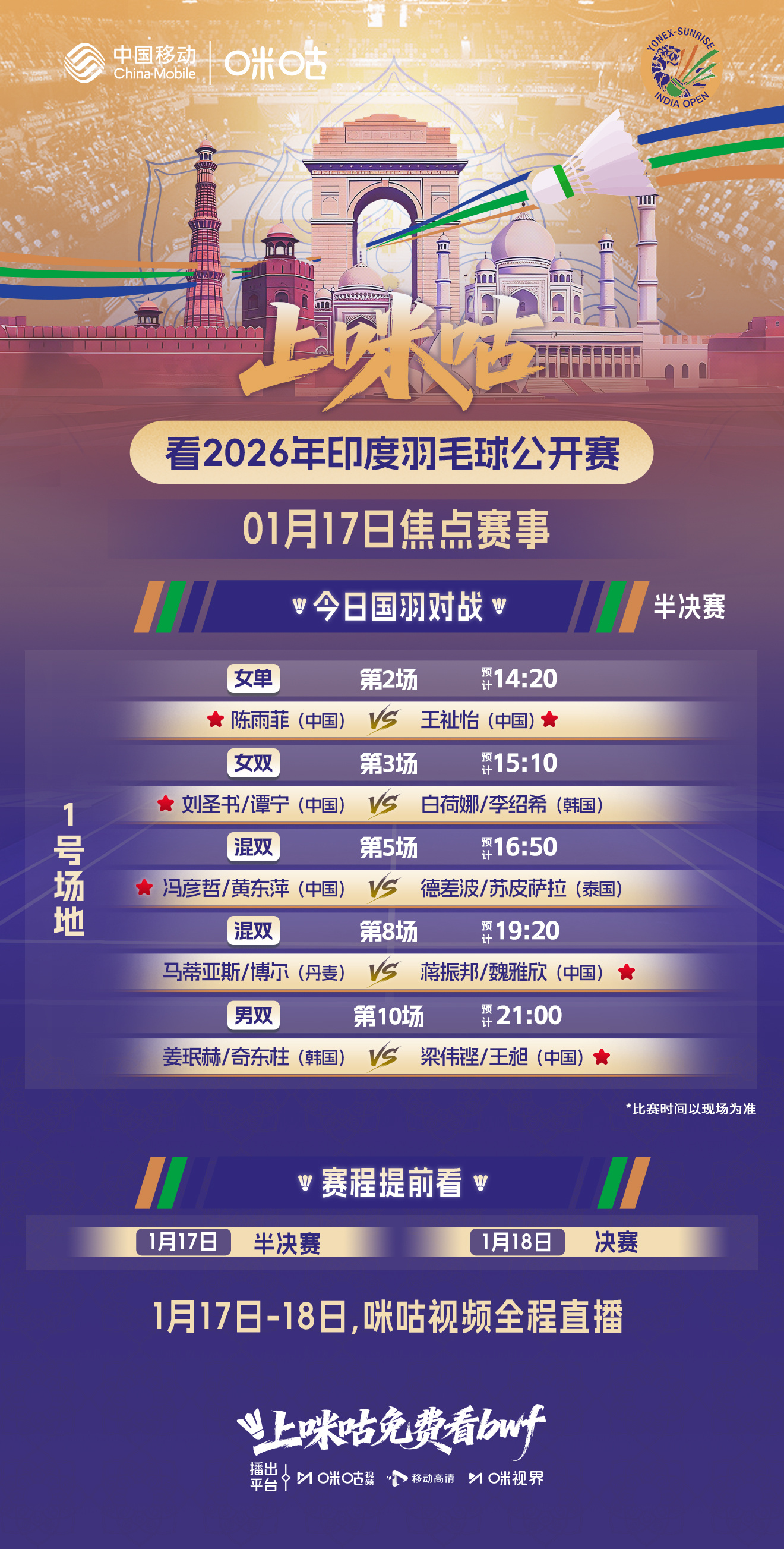 2026印度羽毛球公开赛 🏸半决赛🇨🇳男双焦点|梁王组合迎战韩国男双🔥女单内战|陈雨菲vs王祉怡👊女双|圣坛组合再迎李白组合🔗 #上咪咕看bwf#网页链接#印度羽毛球公开赛半决赛赛程#