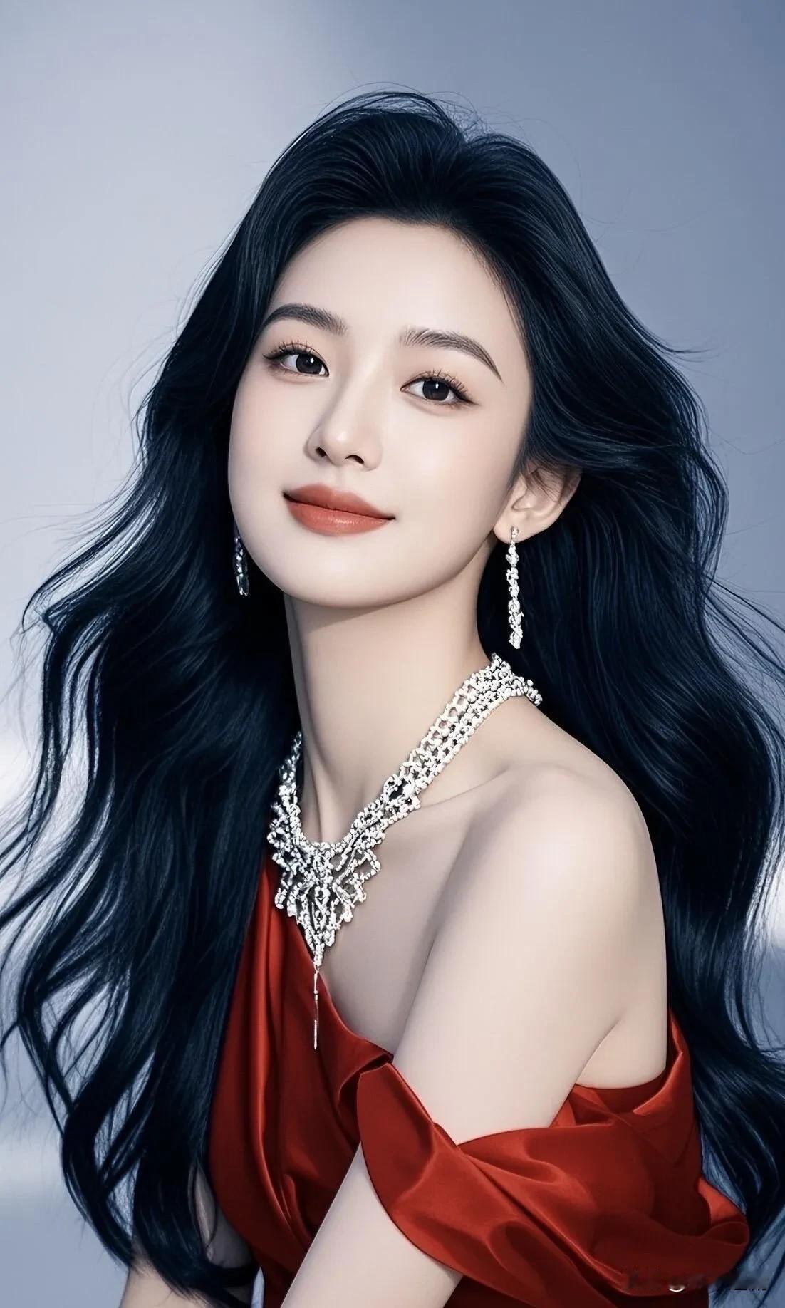 红缎斜肩裙衬着凝脂肌肤,满钻颈饰与耳坠交相辉映,墨色卷发拂过肩头,在浅灰背景里漾