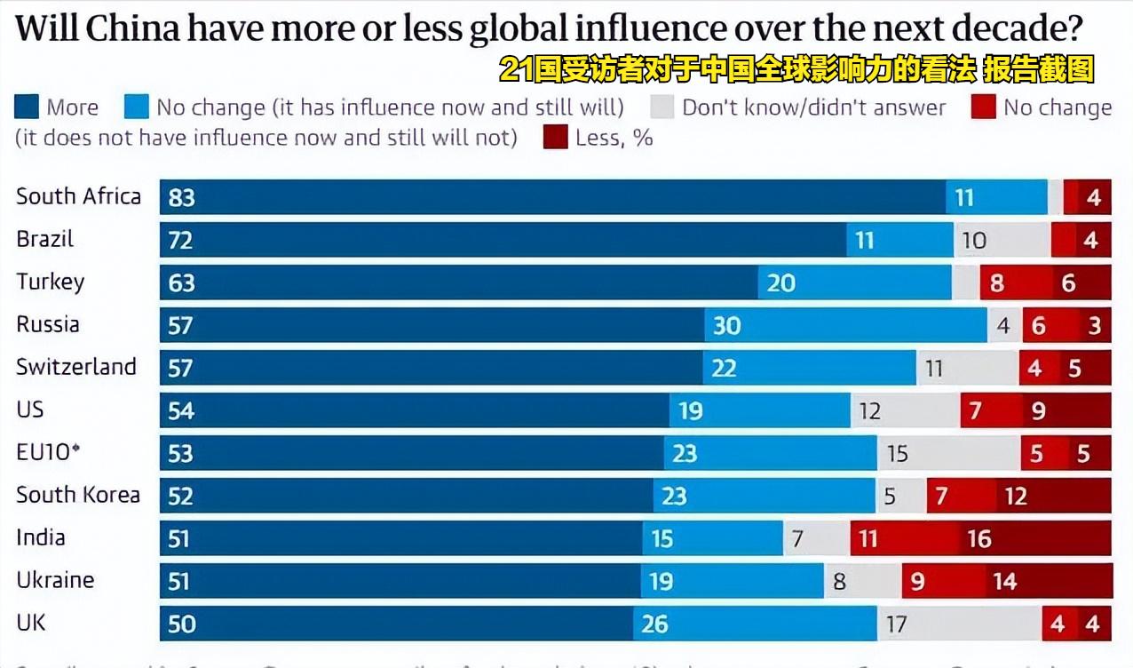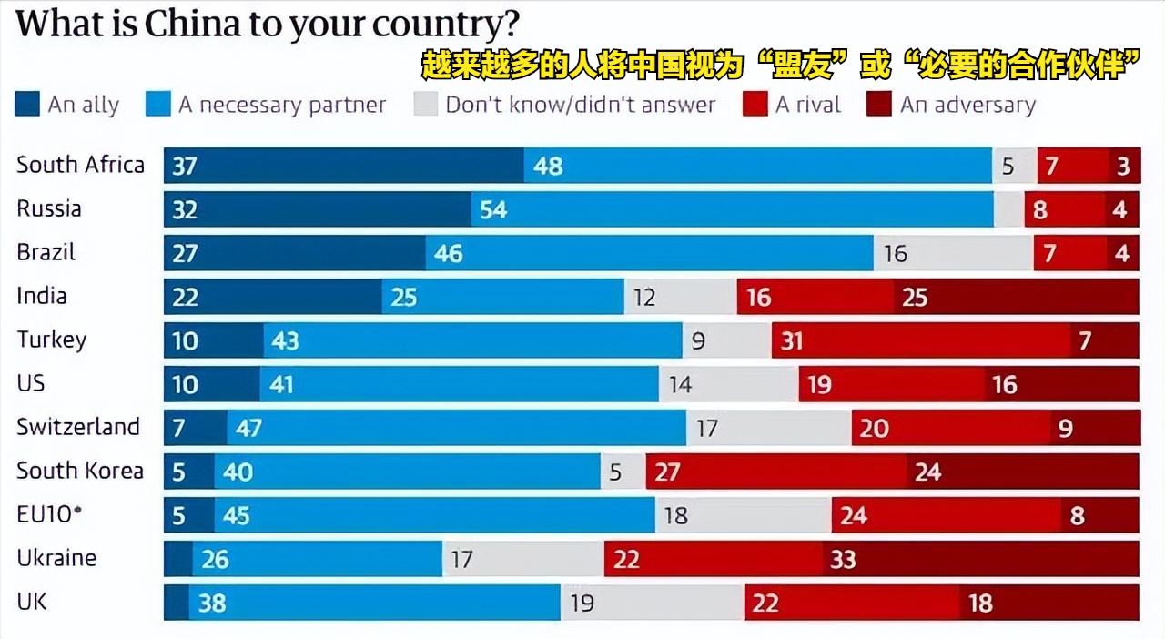 特朗普想让美国再次伟大,结果却把中国推上了世界的中心! 欧洲一份最新民调,揭示了一个残酷的现实:特朗普所推行的“国家优先”政策,在全球许多人看来,最终效果不是让美国再次伟大,反而是帮了中国一个大忙。 去年11月,一项针对21个国家、近2.6万名受访者的调查数据显示,一个清晰的全球共识正在形成。 数据显示,在几乎所有受调查的地区,主流观点都认为,中国在未来十年的全球影响力将会提升。 先看中国。几乎所有被调查的地区,从南非(83%)到巴西(72%),再到欧洲(53%),甚至包括美国自己(54%),多数人都预计中国未来十年的全球影响力只会更强。 大多数欧盟公民相信,中国很快就会在电动车和可再生能源领域成为世界领头羊。 更有意思的是对中国的定位。除了少数几个国家,全世界大多数人并不把中国看作威胁,而是伙伴。在南非和俄罗斯,超过八成的人视中国为“必要伙伴或盟友”。 再掉头看看美国,风景就完全不同了。除了少数几个发展中大国,几乎没人相信美国的影响力还会增长。 最尴尬的,是美国的盟友身份。这份民调里,美国的“盟友”含金量暴跌。放眼全球,只有印度还有超过半数的人(54%)坚信美国是盟友。 欧洲的数字更是惨不忍睹。整整十个欧盟国家里,只有区区16%的人还把美国当“盟友”,20%的人甚至视其为“对手或敌人”。超过一半的人(51%)给出的定位是“必要伙伴”。 这个词很微妙,它意味着合作只是出于需要。说白了,就是“离不开,但信不过”。这种心态,恰恰是特朗普外交政策种下的果。 特朗普信奉“大国被畏惧比被爱戴更好”。他上台后,又是干预委内瑞拉,又是对格陵兰岛动心思,典型的交易主义。 结果呢?美国的传统对手,比如俄罗斯,反而不那么怕它了。民调显示,俄罗斯人现在更视欧盟为“敌人”,对美国的敌意反而从48%降到了37%。 而美国的盟友,尤其是欧洲,却感觉越来越疏远,甚至觉得那个曾经的北约“老大哥”,如今更像一个“敌对势力”。大家不再相信美国是那个靠得住的保护伞。 这种不信任直接改变了欧洲的行动。乌克兰在寻求支持时,更多地把目光投向了布鲁塞尔,而不是华盛顿。欧洲各国也越来越支持自主重新武装,要把安全感攥在自己手里。 说到底,特朗普的所作所为,等于亲手给其他国家递上了一张“邀请函”:既然美国这套体系靠不住了,你们完全有理由去和北京建立更紧密的关系。 于是,世界被清晰地划成了不同的“认知阵营”。 一边是像乌克兰和韩国这样,安全上高度依赖美国,不得不继续站队;另一边则是广大的全球南方国家,经济合作的需求压倒了一切。 在这场全球心态的巨变中,最纠结、最迷茫的,莫过于欧洲。报告直言不讳地指出:“欧洲人是世界上最悲观的人。” 近半数(46%)的欧洲受访者不相信欧盟有能力与中美平等过招。他们既担心俄罗斯的“侵略”,又害怕美国的“不可靠”,同时还对中国的崛起感到不知所措。 报告给欧洲的建议是,要“务实又大胆”,在这个“百年一遇”的时代找到成为世界一极的方法。但这恰恰是欧洲最难做到的,知易行难。 这场全球范围内的心态转变,已不是简单的“东升西降”四个字可以概括。“美国优先”逐渐演变成了“中国机遇”,曾经的盟友也开始离心离德。 未来的世界,竞争的关键或许不再是谁的拳头更硬,而是谁能在新的全球供应链中扮演更可靠的角色。 直到今天,世界正变得更加开放地接纳中国。而这一切的背后,总能看到美国政策投下的影子。