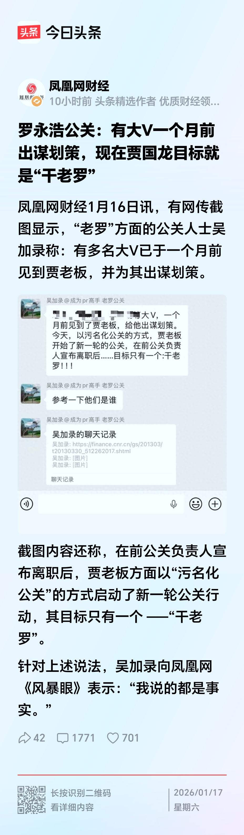 老贾老罗做神马,蛛丝马迹吃丝瓜。 此生只做一件事,西贝。此生只爱一个人,贾夫人。昨天老贾朋友圈那篇长文最后奇奇怪怪的这句,想来好像就能理解了。 今时今日的社会舆情怎么谈控制呢。满天星的自媒体,有影响力的,没影响力的,头发丝段位的,脚底皮随便写,公域的,私域的,正文区的,评论区的,只会用摄像头流水账的,还有会剪辑配音乐的… 家旁边购物中心的西贝应该还开着,危机刚出的时候还说过去吃一次,人都落座了告知没有优惠,我起身就把家人拖走了。今天管他有没有优惠都去吃吧,就是单纯的想吃,不知道小赵配不配合出个门。 到现在,我相信老贾说的的。接触过这类型的老板。昨天有一篇自媒体文章标题叫什么老贾决定同归于尽…看得有点替他心酸。不过,也没觉得老罗有做错什么。