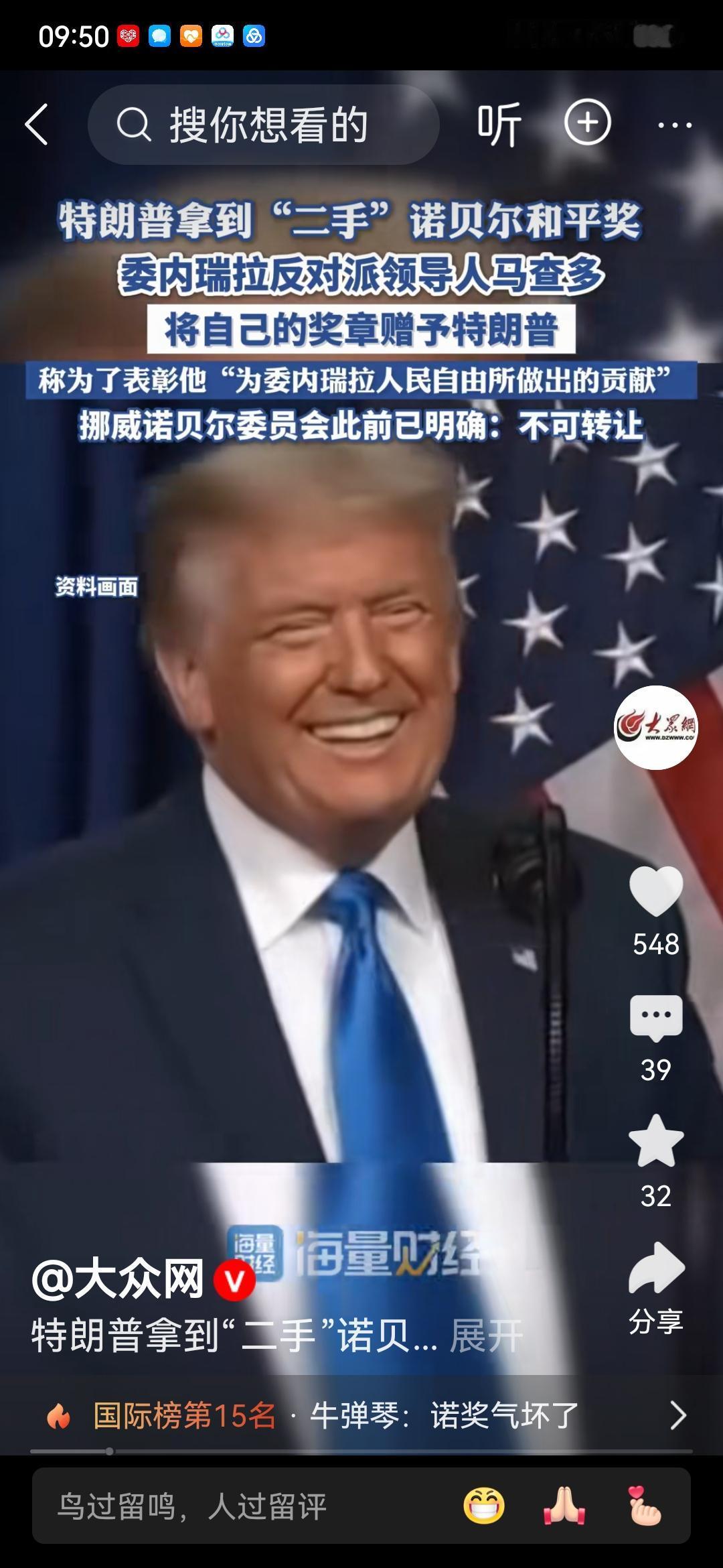 特朗普获得了诺贝尔和平奖! 当委内瑞拉反对派马查多将自己的诺贝尔和平奖赠送给特朗普的时候,特朗普喜笑颜开,心花怒放 ,还真以为这就是诺贝尔和平奖的获得者 。 其实马查多是希望特朗普推翻马杜罗政权,让自己有机会走上委内瑞拉的执政党。 第一,马查多这种拉拢域外政治力量来干预本国政治的做法就是对自己国家的背叛,是很不耻的事情。 第二,美国对委内瑞拉的袭击和对总统马杜罗的绑架是赤裸裸的侵略。 第三,挪威诺贝尔颁奖委员会对马查多的这种赠予认定为无效。 第四,马查多所称表彰特朗普对委内瑞拉人民自由做出的贡献的表述不符合国际政治主流态度,也不符合实际情况。