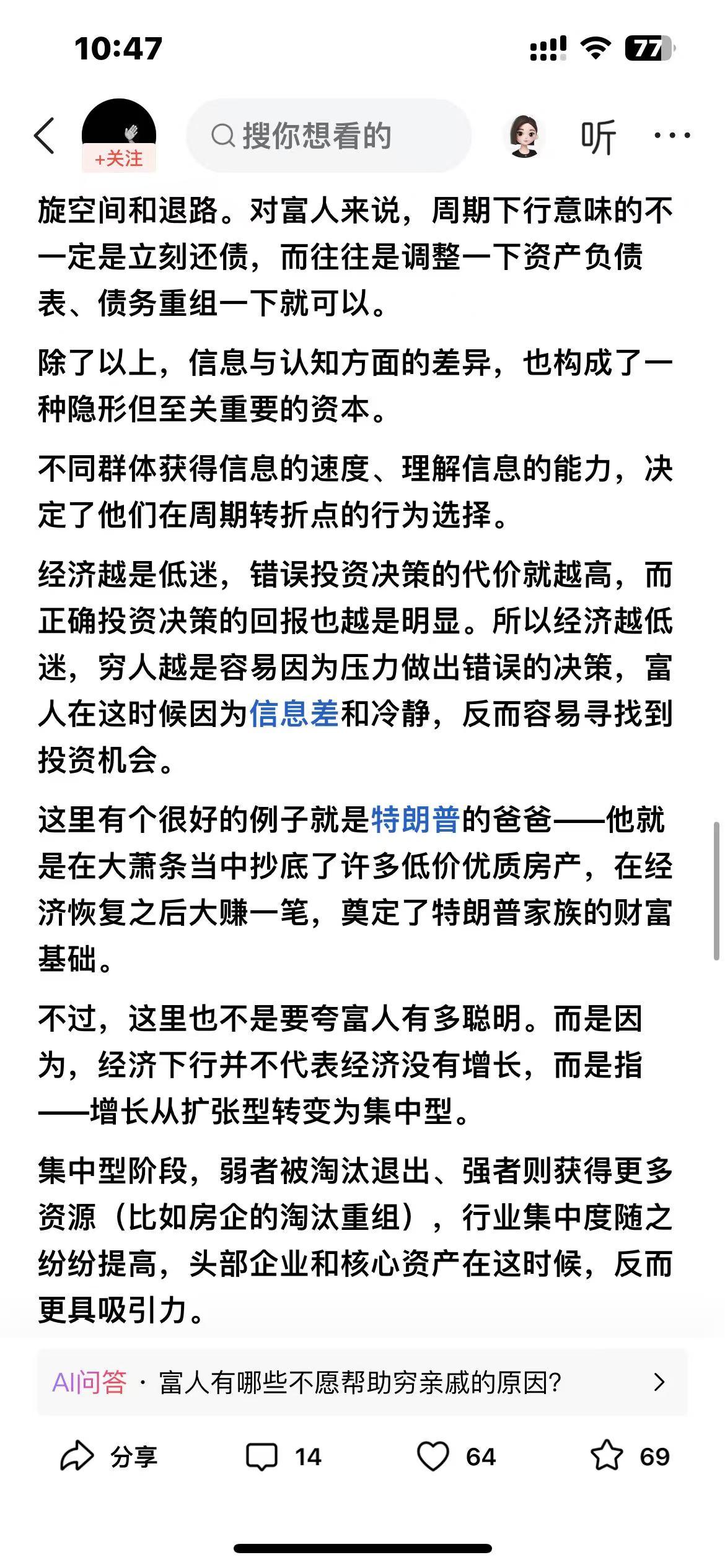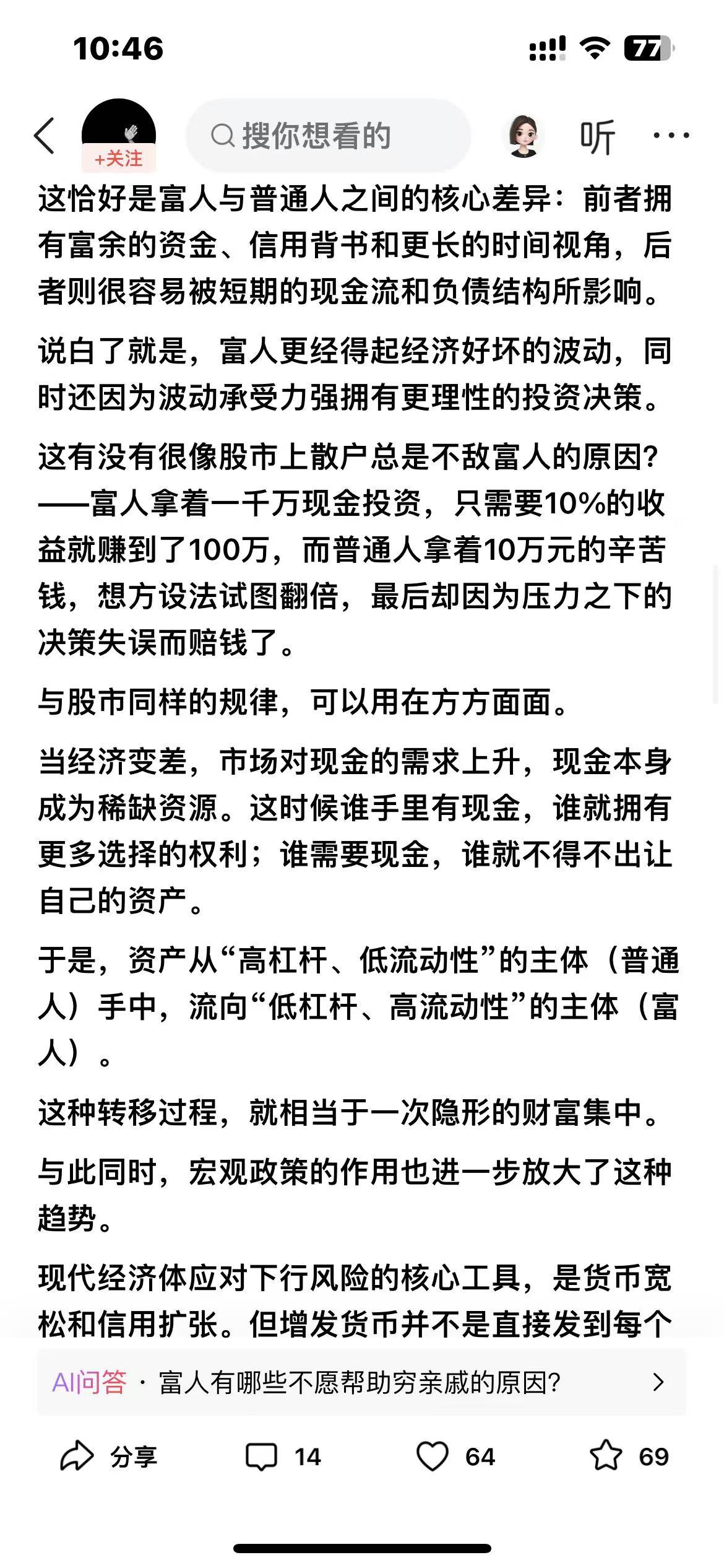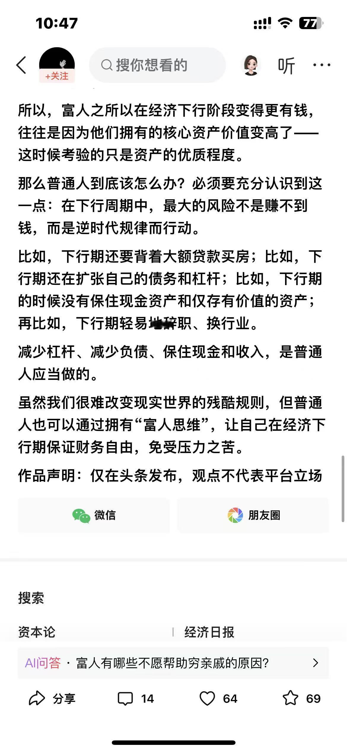 刷到这篇文章才恍然大悟,原来经济差的时候,富人不是在渡劫,是在 “捡钱”!标题《经济变差,为什么富人却变得更有钱了?》简直是当代人共同的灵魂拷问 —— 我们节衣缩食还房贷,富人却能逆势加仓豪宅、玩转高端金融产品,这差距到底在哪? 文章扒得太狠了:说白了就是 “劳动赚钱” 干不过 “资产生钱”!经济下行时,企业先砍工资裁员,打工人直接承压;可富人靠存量资产和长期契约,账面波动根本不影响生活,还能趁着别人急用钱,低价收资产。更气人的是,政策放水先流进金融市场,最后还是富人受益,工资却纹丝不动。 信息差更是致命伤,穷人慌着乱投资踩坑,富人靠着精准信息抄底。不过话说回来,知道了这些规律,咱们普通人除了降杠杆、存现金,还能怎么抓住小机会?有没有试过用 “富人思维” 做过一次正确决策?