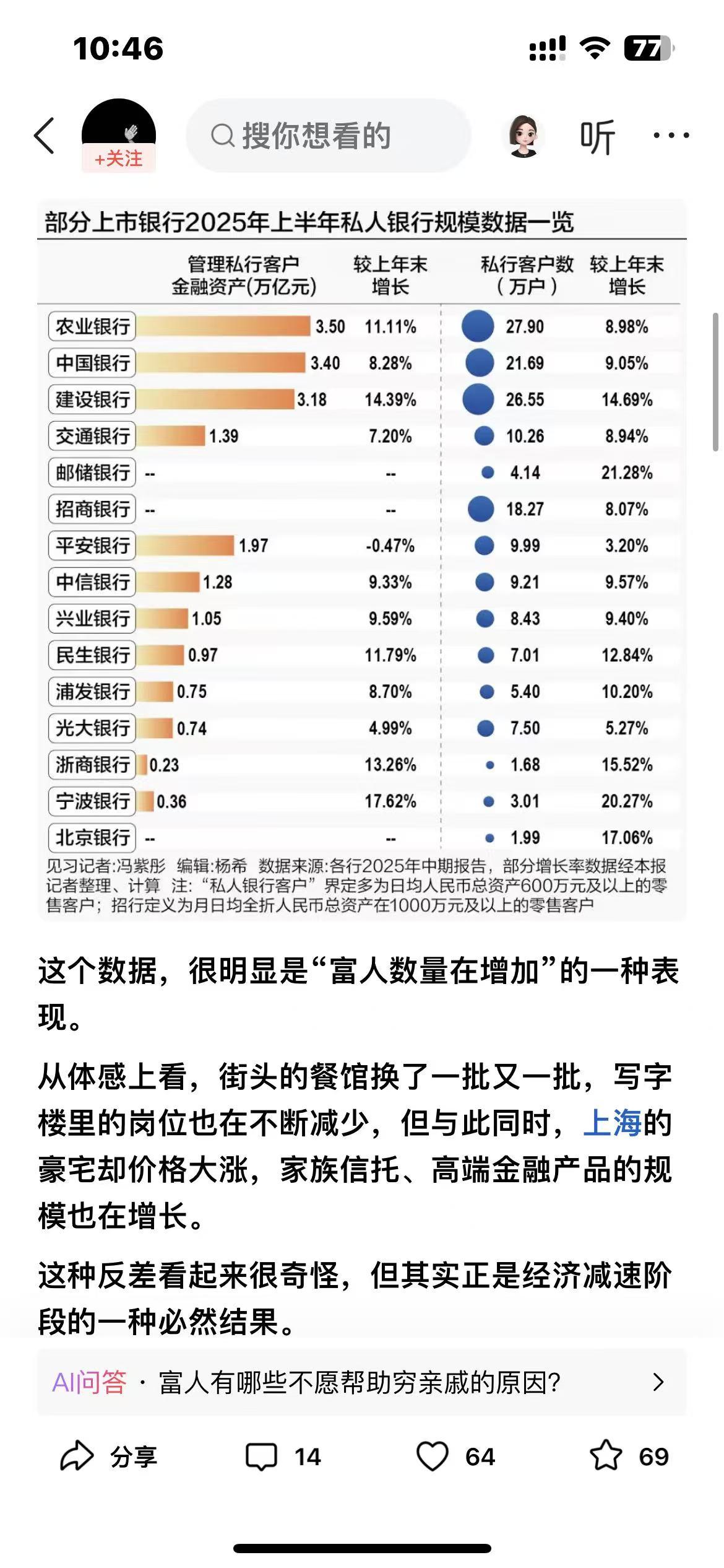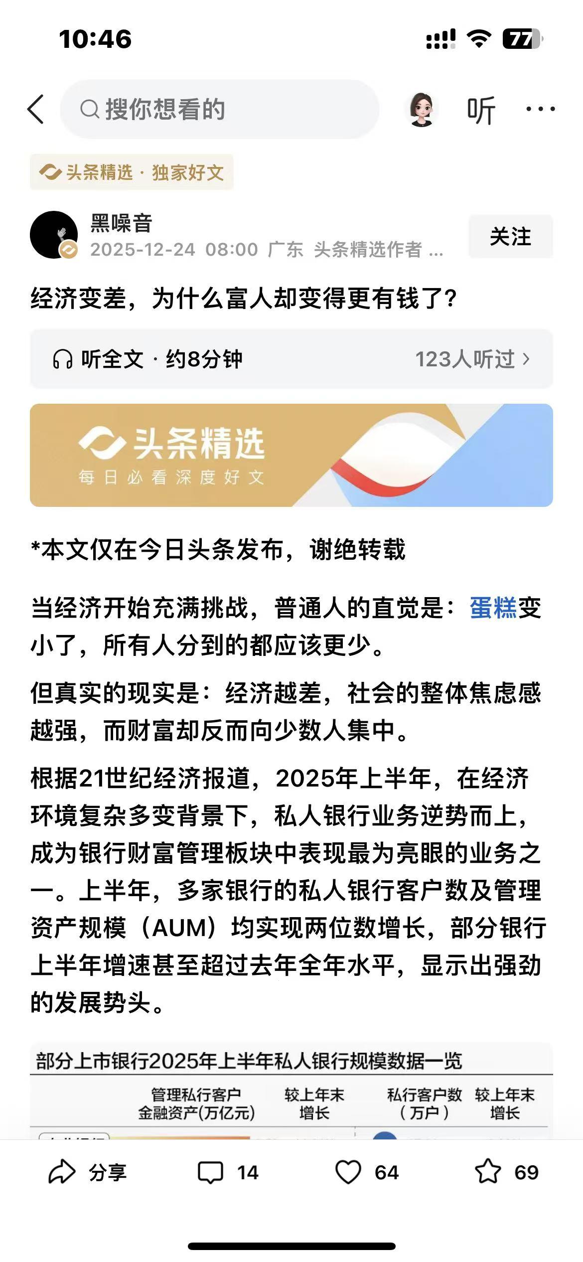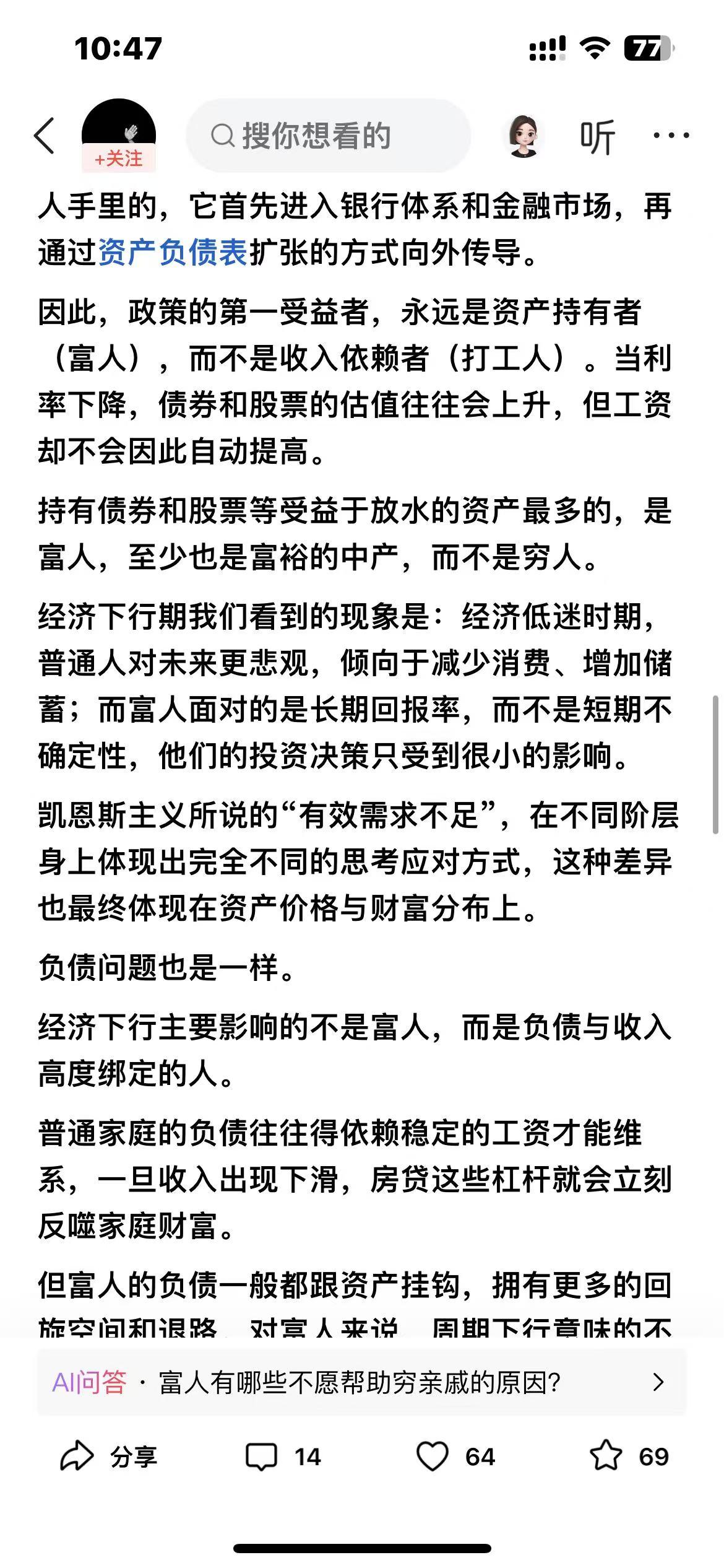 刷到这篇文章才恍然大悟,原来经济差的时候,富人不是在渡劫,是在 “捡钱”!标题《经济变差,为什么富人却变得更有钱了?》简直是当代人共同的灵魂拷问 —— 我们节衣缩食还房贷,富人却能逆势加仓豪宅、玩转高端金融产品,这差距到底在哪? 文章扒得太狠了:说白了就是 “劳动赚钱” 干不过 “资产生钱”!经济下行时,企业先砍工资裁员,打工人直接承压;可富人靠存量资产和长期契约,账面波动根本不影响生活,还能趁着别人急用钱,低价收资产。更气人的是,政策放水先流进金融市场,最后还是富人受益,工资却纹丝不动。 信息差更是致命伤,穷人慌着乱投资踩坑,富人靠着精准信息抄底。不过话说回来,知道了这些规律,咱们普通人除了降杠杆、存现金,还能怎么抓住小机会?有没有试过用 “富人思维” 做过一次正确决策?