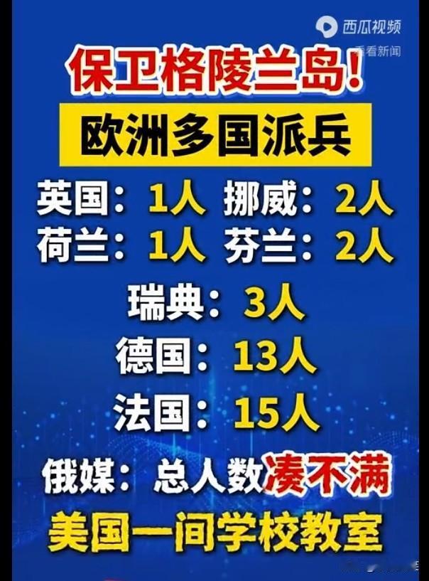 欧洲7国总共派兵格林兰岛37人。 对此,俄《今日俄罗斯》发表社评,截止目前,欧洲即将部署到格林兰岛的大军,总人数凑不满美国一间学校的教室。