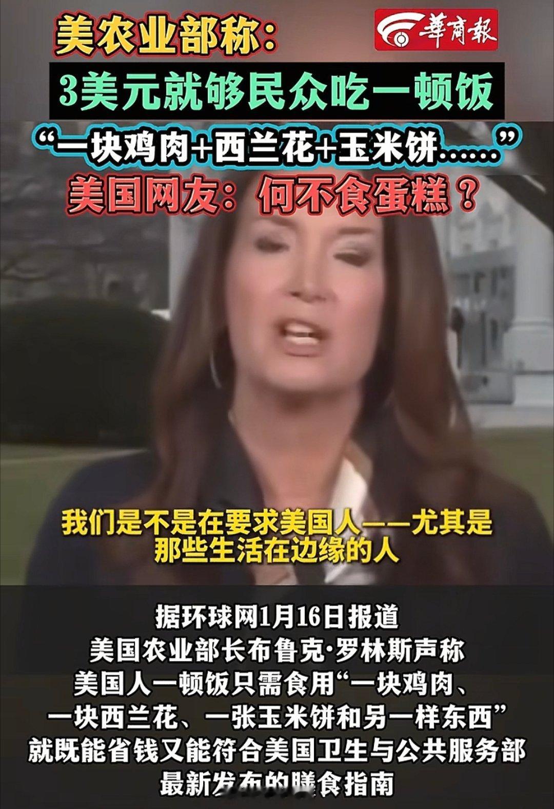 让美国陷入自证陷阱,就是斩杀线理论最好的进攻!美国农业部部长出来自证了:美国没有斩杀线,以3美元就能在美国吃一顿正餐。所谓的正餐是什么呢,原来就是一张薄饼,一块西兰花和一块鸡肉,就这点东西喂吉娃娃都不够,人吃能够吗。还煞有介事的说这符合美国卫生与服务部的最新膳食指南。说实话,以前都是别人指责我们,我们往往陷入被动,自己找证据,苦口婆心的跟人家说,证明人权,证明自由,证明法治等等……现在好了,一个斩杀线,让美国也进入自证状态,果然进攻才是最好的防守。