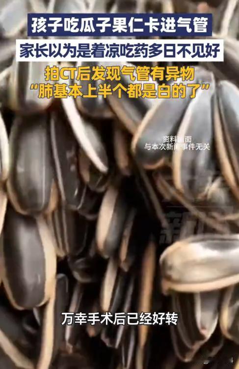 “悲剧还是发生了!”近日,一3岁男童在吃瓜子时突然摔倒,第二天,就出现咳嗽低烧的症状,家长喂了点感冒药后仍旧不见好,并且还愈发严重,孩子开始咳嗽剧烈、呼吸急促,慌忙送医后竟发现半个肺都变白了!网友:太吓人,家长千万警惕! 孩子咳嗽发烧是家长常遇的情况,不少人会下意识归为普通感冒,自行喂药缓解,却忽略了有些症状背后藏着的巨大风险。 据媒体1月16报道,这名3岁男童在家吃瓜子时,突然跑起来玩,不料一下摔倒了,出现呛咳反应,但仅过了两分钟,孩子就恢复了正常状态,家长觉得只是小意外,也就没有在意。 可第二天,孩子就出现了轻微咳嗽、低烧的症状,家人以为是普通感冒,就给孩子喂了儿童感冒药。不料连续用药几天后,孩子的病情不仅没有好转,反而急转直下:咳嗽变得剧烈频繁,呼吸时还带着喘息声,稍微活动就会憋得满脸通红,精神状态也越来越差。 看着孩子痛苦的模样,家长再也不敢拖延,赶紧抱着孩子赶往当地医院急诊。检查结果出来后全家人如遭雷击:孩子的气管内卡着一颗瓜子仁,异物长期堵塞引发了严重的肺部感染,影像片上清晰显示半个肺都已经发白。 家长懊悔不已,不断自责当初没有重视孩子呛咳的瞬间。好在手术及时,孩子术后经过一周的抗感染治疗,肺部炎症逐渐消退,呼吸也恢复了正常。 因此一定要注意,小孩子在跑闹玩耍的时候,尽量不要吃坚果,如果出现呛咳、持续咳嗽、呼吸异常等情况,切勿盲目用药,应立即就医排查异物卡喉可能。 信息来源:《幼儿吃瓜子果仁卡进气管!家长误以为是着凉,吃药多日不见好。去医院拍CT才知道气管卡进异物,半个肺变白!万幸孩子已做手术取出瓜子,目前身体也无大碍@不后悔