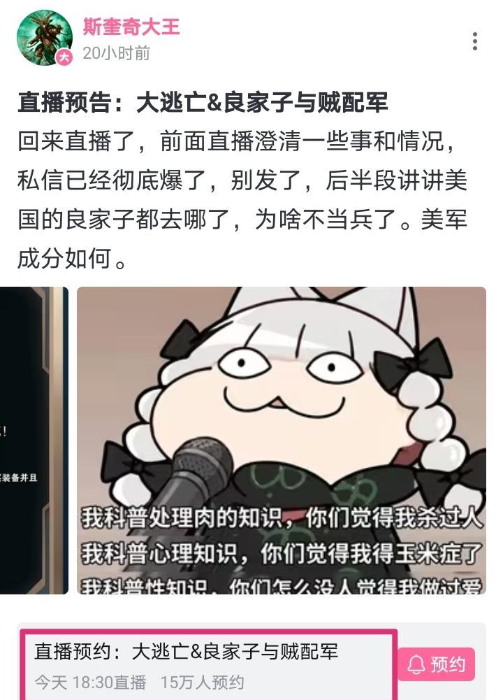【不露脸直播预约破20万,懂了吧,这才是顶流“战术”! 】 这不是直播,这是一场事先张扬的“信息游击战”。 斯奎奇大王今晚的B站首秀,预约人数在最后一小时冲破**20万大关**,直接刷新近期个人直播纪录。 弹幕还没开播就已进入“战时状态”,每分钟数千条的速度,比很多直播高峰期的互动还猛。 **数据不会骗人**。 从“胜利大逃亡”到被四常顶级报刊点名,这个00后已经完成从“事件当事人”到“国际级议题符号”的华丽转身。 他手里的牌,不再是简单的个人经历,而是足以撬动全球舆论场的稀缺素材。 今晚聊什么? 美军的“成分”? 懂的都懂,那本身就是流量核弹。 **虚拟人设的胜利**。 坚持不露脸,恰恰是他最高明的“护甲”。 当脸成为最不重要的标识,观点和叙事本身就成了唯一的武器。 这规避了真人偶像的风险,却把话语的穿透力拉到了最满。 在注意力稀缺的时代,他给所有内容创作者上了一课:神秘感,才是顶级流量的兴奋剂。 预测一句:今晚之后,国内“意见领袖”的玩法将被重新定义。 当一个人能用声音搅动二十万人的情绪池,甚至牵引国际媒体的视线时,传统的露脸、卖货、打赏模式,都显得有点过时了。 **准备好,见证一场“虚拟领袖”对现实舆论的精准爆破。 ** 流量密码 B站直播 舆论战
