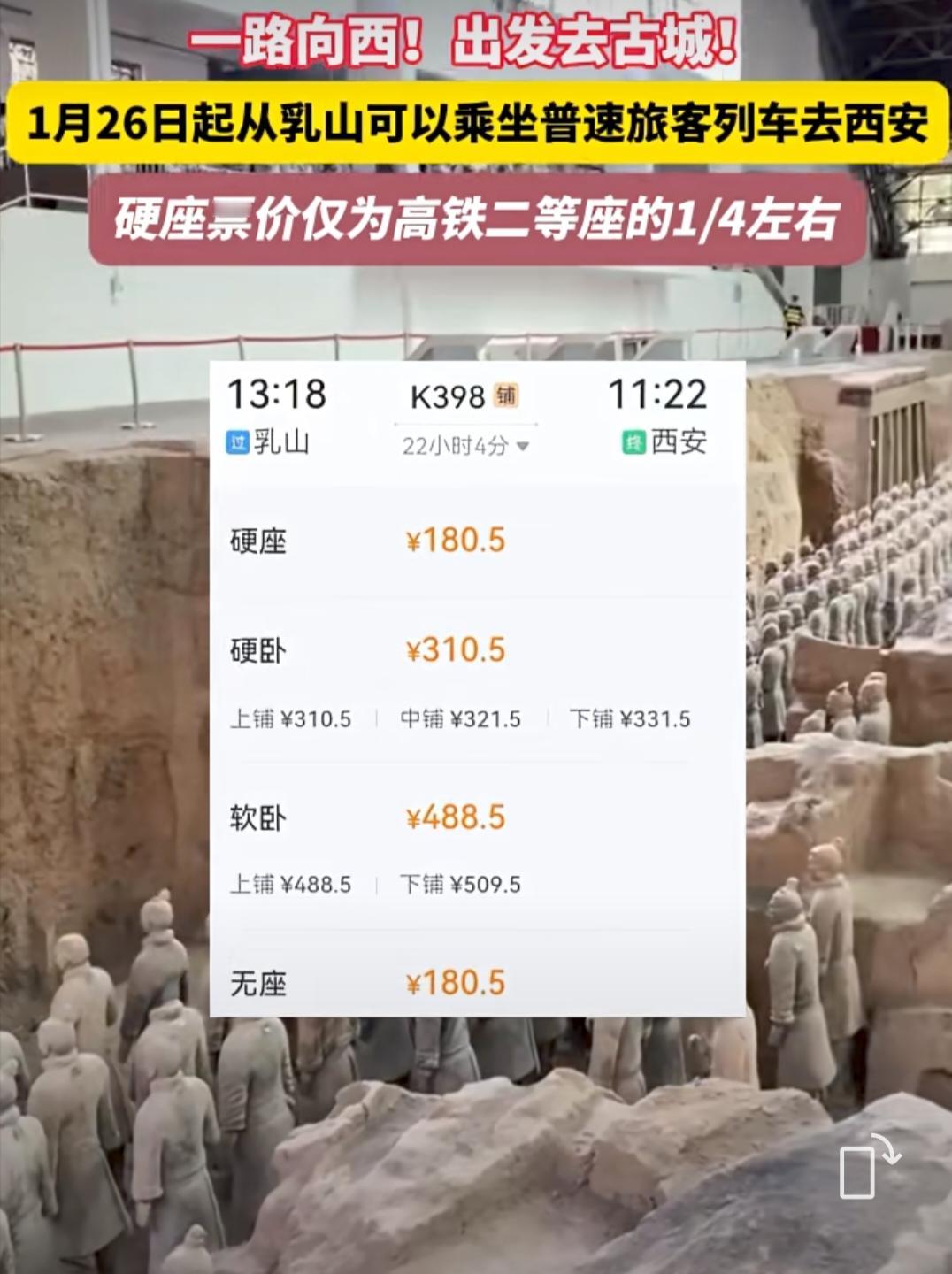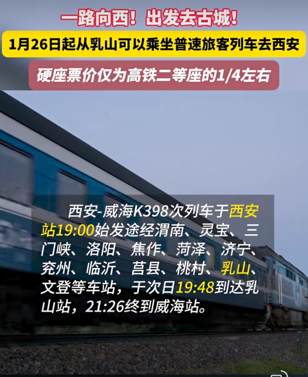 在乳山可以乘坐绿皮火车去西安了。 从1月26号开始可以从乳山乘坐普通火车去西安了,车票是高铁票的1/4,硬座一百多块,卧铺三百多,太方便了,坐一宿第二天到了。 西安很早就想去了,看到票价这么便宜方便,老公又坐不住了,打算去西安过年了[捂脸],诱惑挡不住[笑哭]西安 西安卧铺 西安旅游专列