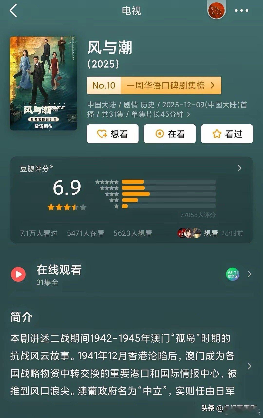 太尴尬了!真没想到任嘉伦新剧存在感这么弱在无人注意的角落《风与潮》开分了可是,貌似声势一点都不大啊分数中规中矩,6.9分在今年国超三部曲中属于中上等其实,剧热度不高,情有可原这毕竟不是一部流量剧而是家国情怀,主流题材国超能出演这样的作品一来,能看出来挑战自己的决心,不再拘泥于自己的舒适区二来,是磨炼自己的演技,和更多老戏骨飙戏实在难得可贵!所以从一开始,这部剧的讨论度不高幸好,国超拿出的成绩合格了说句心里话,他应该继续往正剧方向发展,青春饭不能一辈子,诸如《凤凰台上》一类,还是少演为妙吧