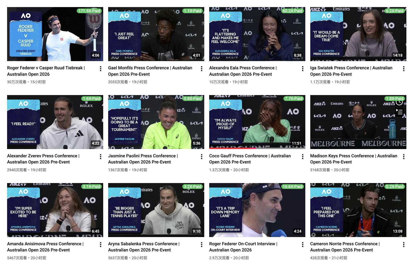 澳网2026 媒体日发布会油管播放量,伊埃拉小姐断层领先其他所有人👁 伊埃拉澳网前三轮潜在对手——第一轮:帕克斯第二轮:穆霍娃【19】第三轮:纳瓦罗【15】