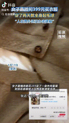 没有性价比!女子在直播间花费399元买了一身休闲套装,收到货后穿身上两天,脱下来准备洗的时候就发现衣服起满了毛球。女子表示,自己也没干活什么的,花费399元买的衣服才穿两天就起球,感到惊讶,自己在国外,衣服是转运过来的,也是没办法退货换货。 花费399元买了一身休闲套装,质量不能说很好,也算差不多,但是只穿两天就起球了,这很明显就是衣服质量有问题。 衣服有时候还是要到实体店购买,虽然说网上的便宜点,但是不能试穿,有问题了退起来也耽搁时间。 女子既然在国外,衣服退不了也换不了,那么就只能当做是花钱买教训了,以后买衣服还是尽量去实体店。