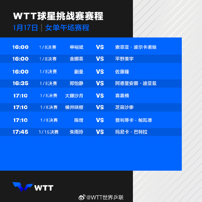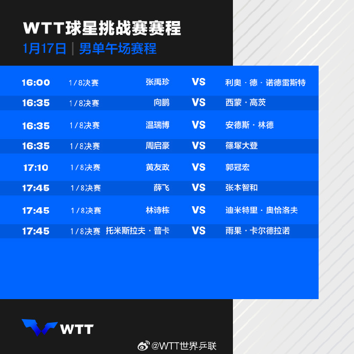 #国乒多哈挑战赛1月17日赛程#16:00 蒯曼vs佐藤瞳16:35 向鹏vs西蒙·高茨16:35 温瑞博vs安德斯·林德16:35 周启豪vs篠塚大登17:10 黄友政vs郭冠宏17:10 陈熠vs普莉蒂卡·帕瓦德17:45 薛飞vs张本智和17:45 林诗栋vs迪米特里·奥恰洛夫18:20 蒯曼/陈垣宇vs金娜英/朴康贤22:00 男单、女单1/4决赛00:55(+1)男双决赛 黄友政/温瑞博vs张禹珍/赵大成#看WTT上咪咕##WTT球星挑战赛多哈站2026#