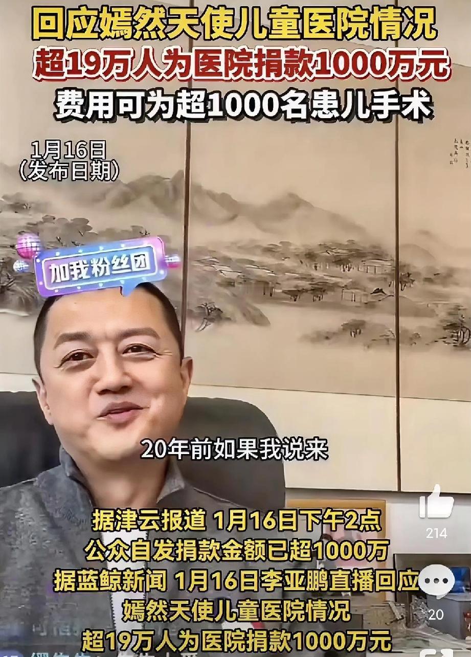 谁能想到,李亚鹏一条坦诚的直播回应,竟让全网网友自发掀起捐款热潮! 他带着嫣然天使儿童医院走过这么多年,没搞过花哨营销,却实打实帮了1.1万名唇裂宝宝,其中7000名患儿的手术完全免费,一分钱都没让家长掏。2026年,他终于还清了医院的欠款,本以为能松口气,却因租金问题面临困境。可他没卖惨博同情,只是如实说明情况,这份真诚瞬间戳中了大家。 网友们太给力了!得知消息后纷纷主动找捐款通道,短短几天就凑了超1000万,19万人的爱心汇成了暖流。李亚鹏坚守公益初心,网友们回馈善意,这哪是简单的捐款,分明是最动人的双向奔赴。善良从不会被辜负,这样的温暖,才是我们最想看到的模样!
