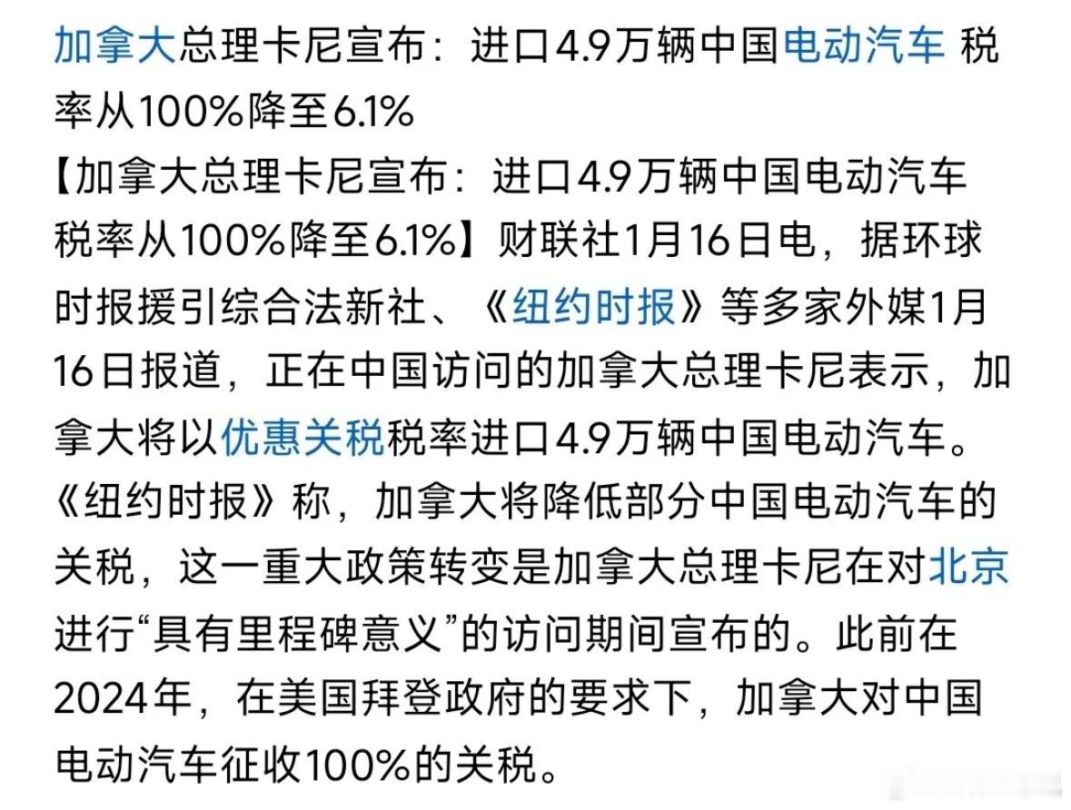 4.9万辆虽少,却是风向大变的信号!曾把中国电动车关税拉到100%的卡尼,如今直接砍了93.9%。说到底,资本认利益不认立场,跟着中国做生意能赚更多,盟友的脸色哪有真金白银香~