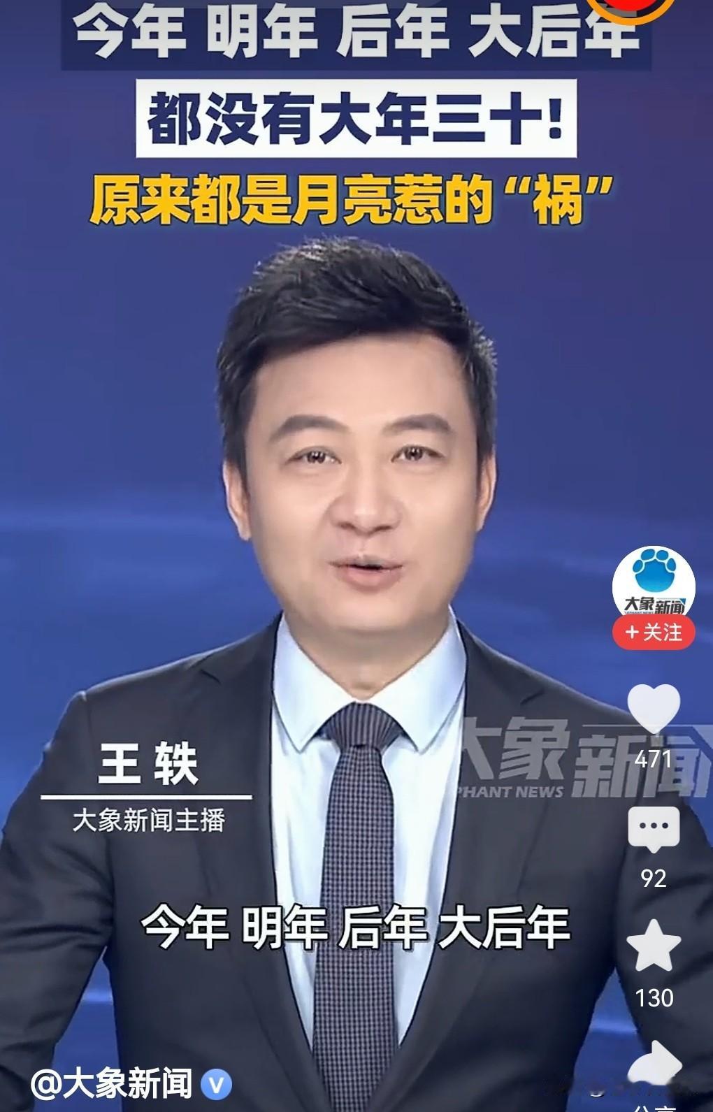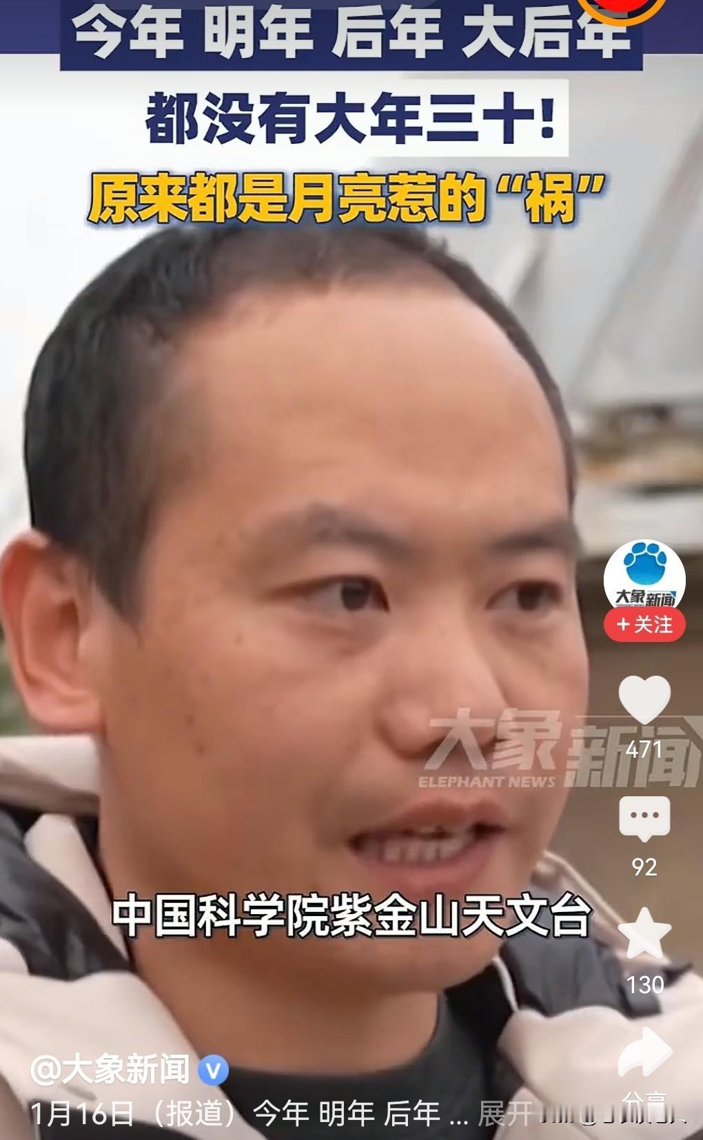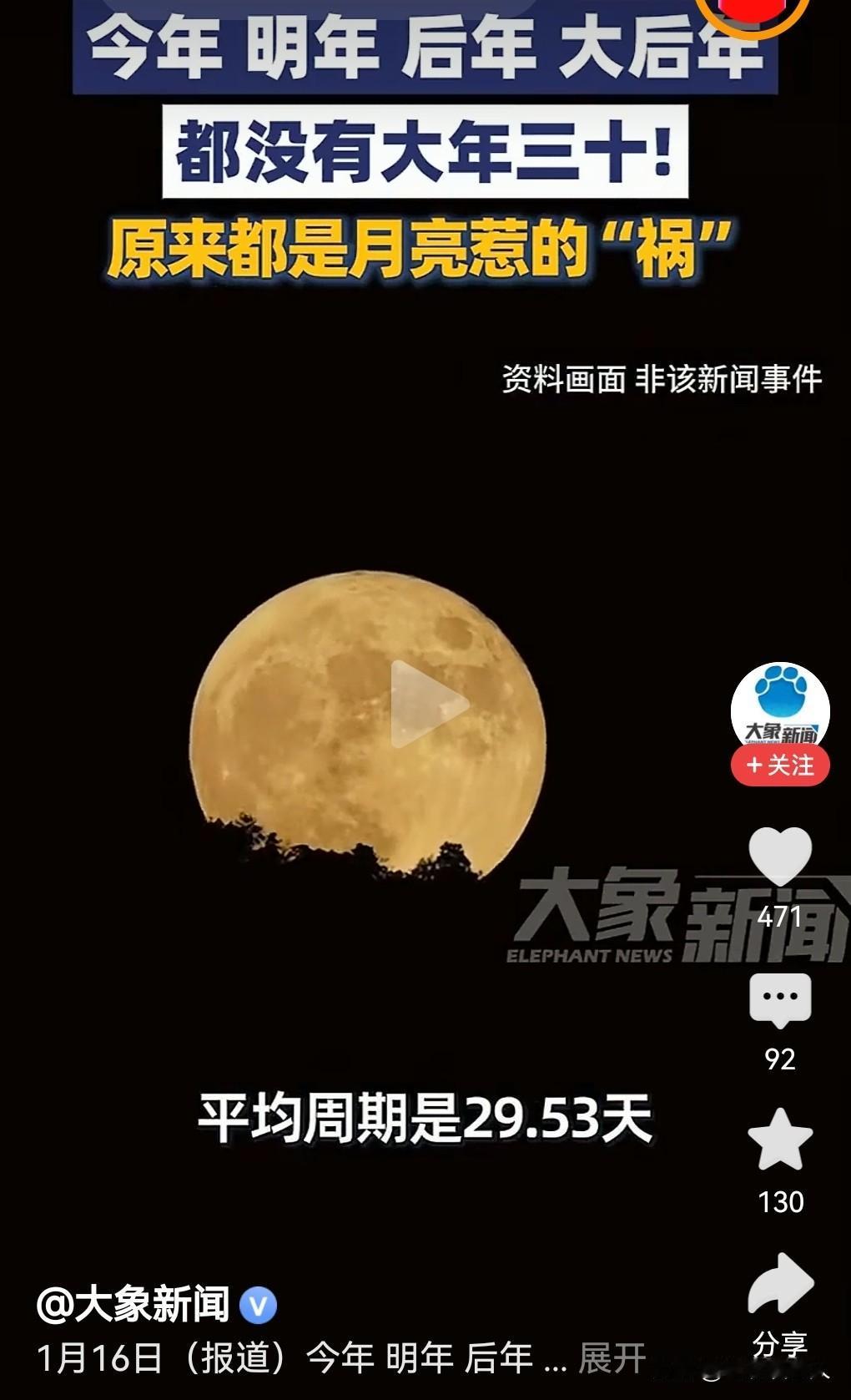 谁偷走了“大年三十”?今年、明年、后年、大后年除夕都是腊月二十九!没有大年三十!原来都是“月亮惹的祸”! 媒体报道,今年过年,除夕是农历腊月二十九日,没有大年三十!更加奇怪的是,明年、后年、大后年、大大后年,都没有大年三十这一天! 本人不以为然,找来万年历,翻开仔细一查看,果然发现,从2025年到2029年之间,一共5年时间都没有大年三十这一天,实属罕见! 这究竟是什么原因造成的?大年三十这一天,是谁“偷走”了? 本人只知道,农历的一个基本特性是一种阴阳合历,农历是依据月亮围绕地球运行的规律的一种计时历法。 我国农历月份的长度规定,不是像公历由太阳和地球运行规律来决定的,而是由月亮绕地球运行的规律来决定的,农历是由月亮说了算,不是太阳说了算。 那么,月亮绕地球运行一周,所行走的平均时间是:29天12小时44分2.8秒,大约29.53天。 在实际计时过程中,每一天只能用整数来表示,不能用小数来表示,因为,大家知道,表示月份的天数,是不会带小数点的,都是整数。 所以,聪明的古人,便把29天的月份叫做“月小”,把30天的月份叫“月大”,由月大和月小来交替排列,尽量使所制定的农历历法,基本接近朔望月的平均时长,解决了带小数点天数的问题。 农历的历法,必须要满足每一个月和每一年,月亮圆缺规律,即朔月和望月交替出现的平均时长规律,因此,当腊月碰上月小的时候,自然腊月只有29天,就没有30这一天了,那么,除夕就是腊月二十九日。 所以,就像2026年至2029年,每一年的腊月都是月小,都只有29天,没有30天,因此,“大年三十”就集体消失了,被“月小”偷走了。 总而言之,这些现象都是由月亮绕地球运行的规律来决定的,连续5年过年没有大年三十这一天,都是“月亮惹的祸”! 以上是本人观点,如有不妥,请大家在留言区处留下你宝贵的意见,并积极参与评论。