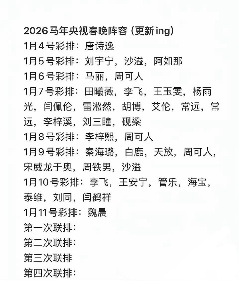 这份名单里有你们期待的艺人吗?白鹿春晚联排刘宇宁马年央视春晚首次联排