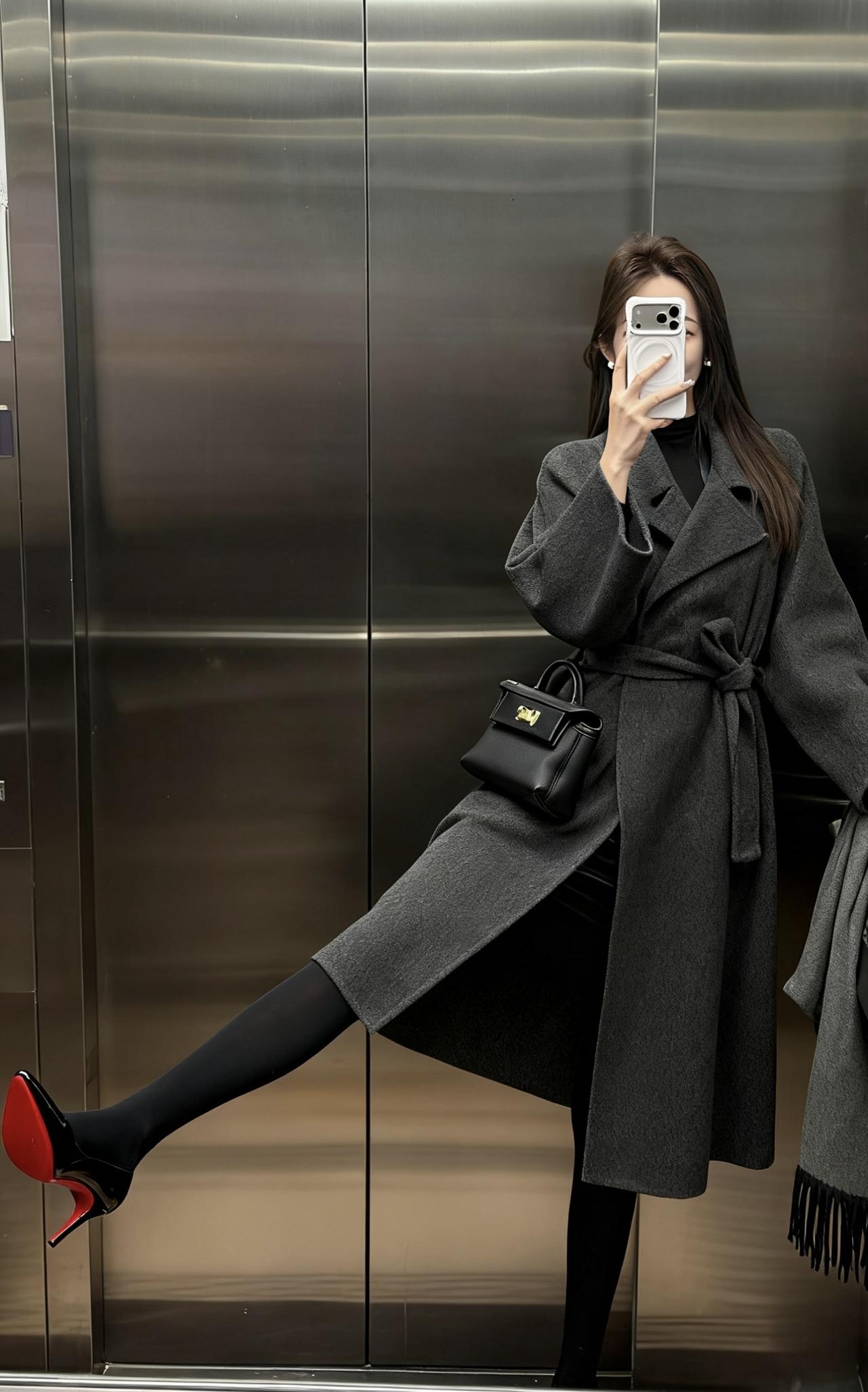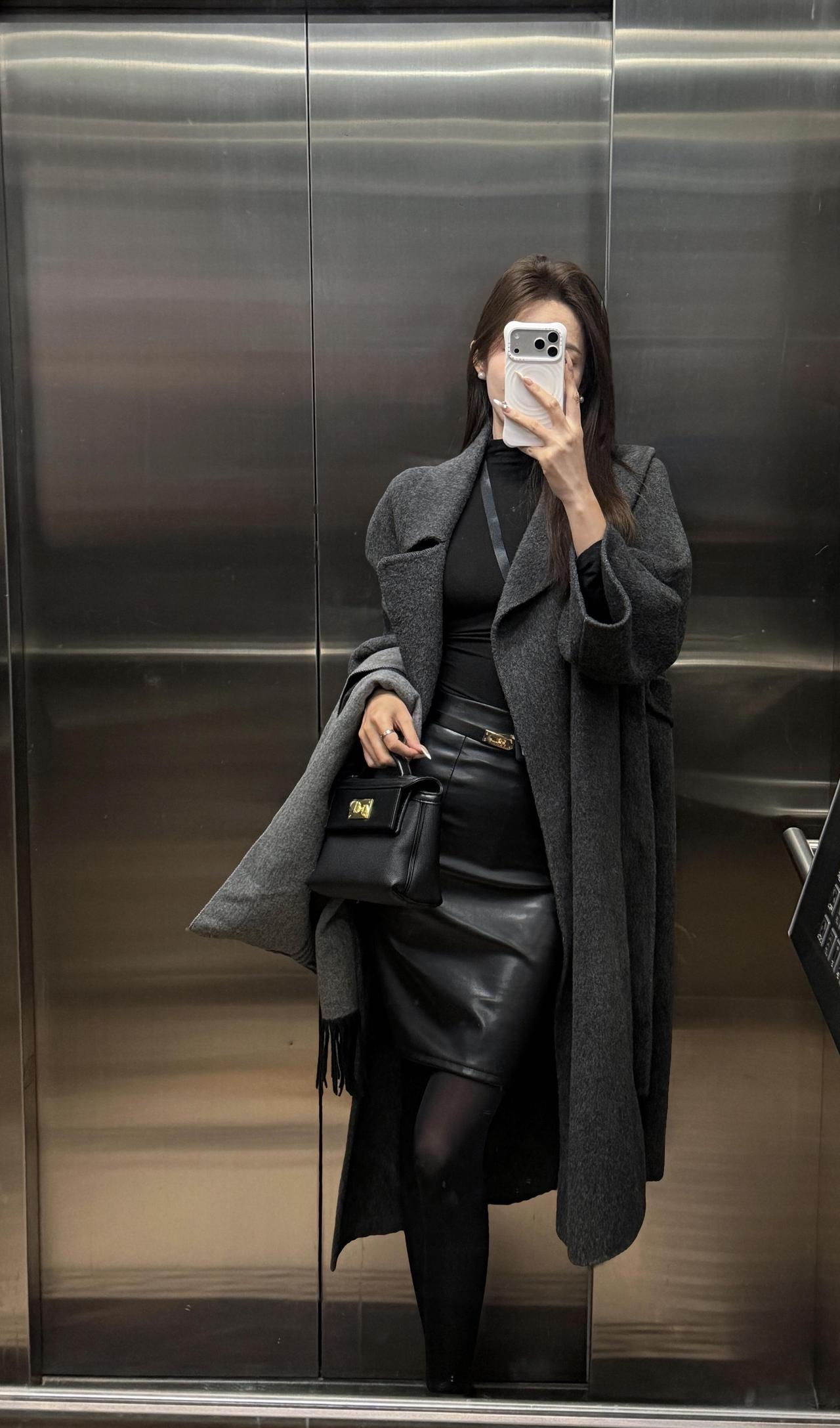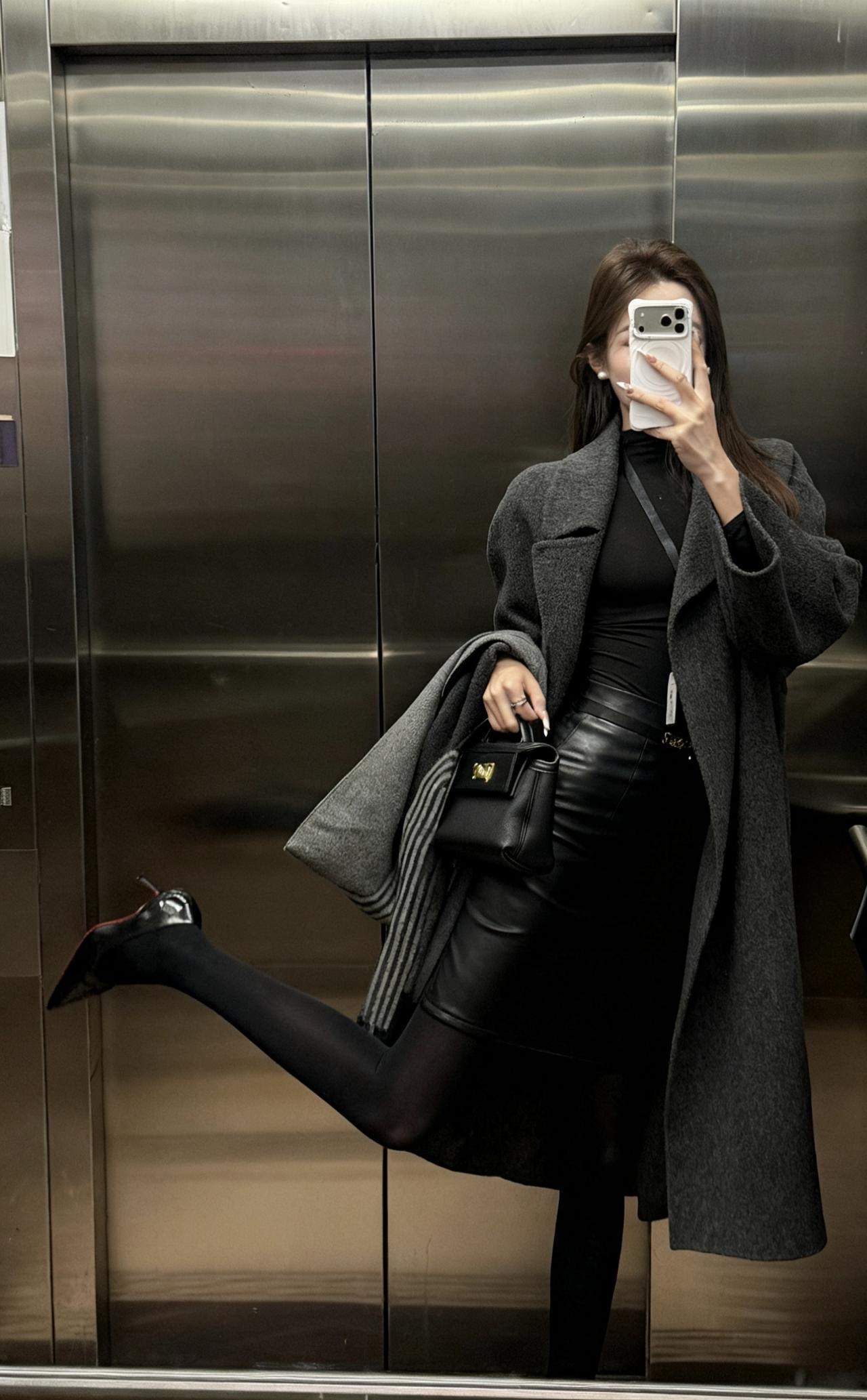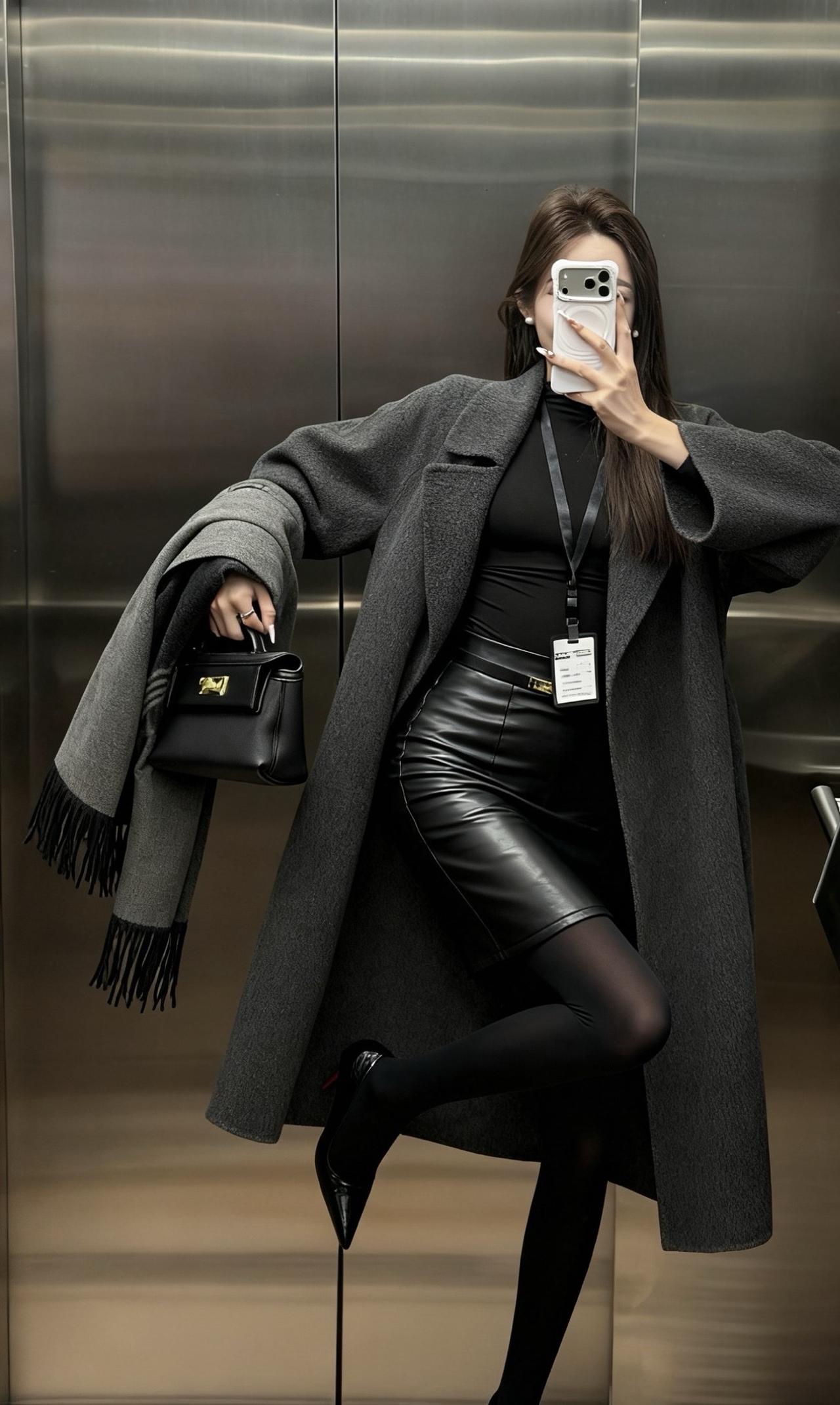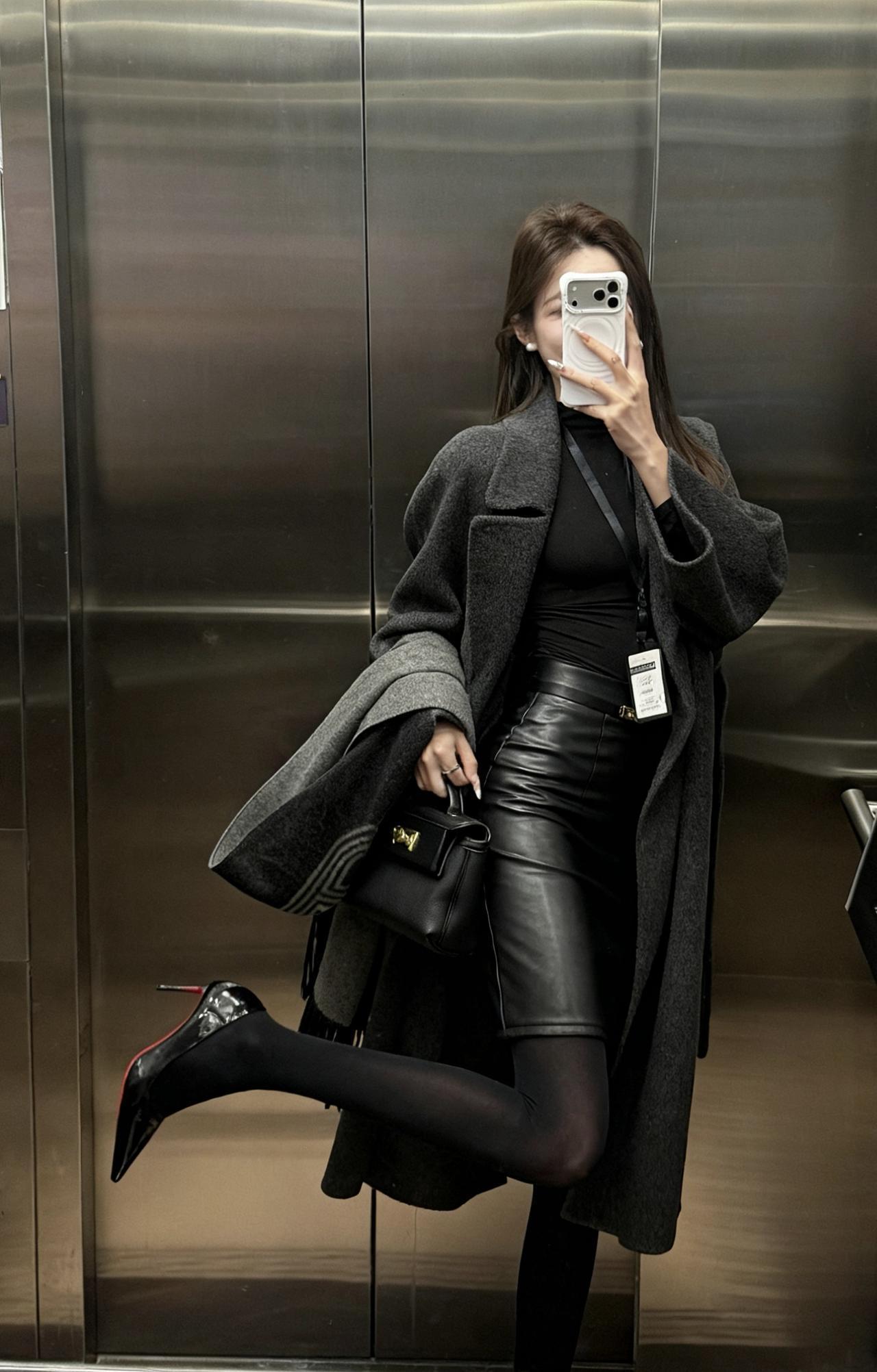 今日穿搭(OOTD) 今日穿搭推荐:职场御姐风,兼顾了保暖与精致感: • 外套:深灰色长款羊毛大衣,宽松版型自带气场,垂坠感好,是秋冬通勤的经典单品。 • 内搭:黑色高领紧身衣+高腰皮裙,紧身设计勾勒曲线,皮质面料增加酷感与精致度,腰带点缀提升腰线,优化身材比例。 • 配饰:同色系格纹围巾增加层次感,黑色腋下包简约实用,整体色调统一,高级感拉满。 • 下装:黑色高跟鞋+黑丝+皮裙的组合,在保暖的同时保留了女性的柔媚与性感,平衡了大衣的厚重感。 适合场合: 1. 职场通勤:深灰色大衣的沉稳感+皮裙的精致感,能展现专业度的职场,也不会太严肃,又能体现个人品味。 2. 商务约会/晚宴:大衣一脱,内搭的紧身衣+皮裙立刻变得性感又有气场,适合和客户的商务晚餐或正式约会。 3. 城市逛街/看展:宽松大衣自带松弛感,搭配皮裙又不失时髦度,适合秋冬的城市漫步、看展等休闲又需要一点造型感的场合。