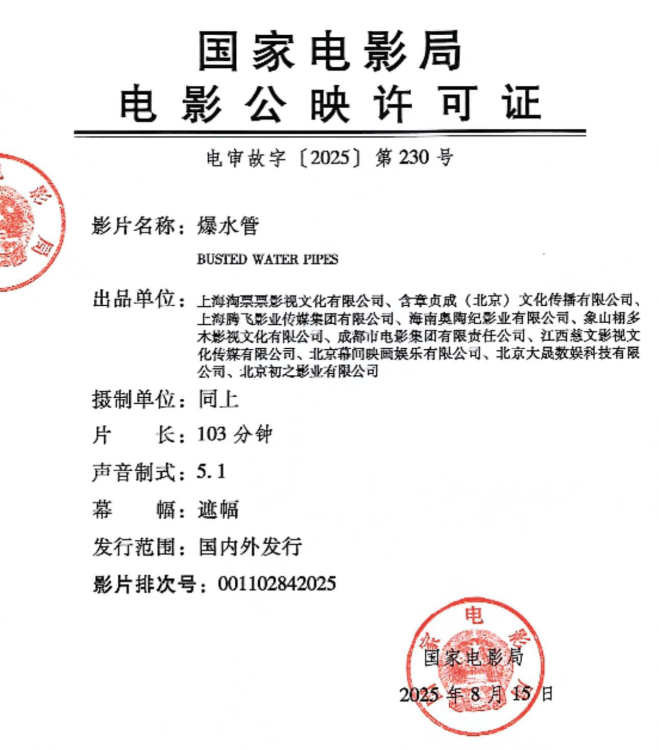 影讯 01.23爆水管 影片信息(18点上片)国 别:中国类 型:犯罪、喜剧片 长:103分钟幕 幅:遮幅声 制:5.1语 别:国语发行版本:数字2D放映期限:2026年01月23日 18:00 - 2026年02月22日