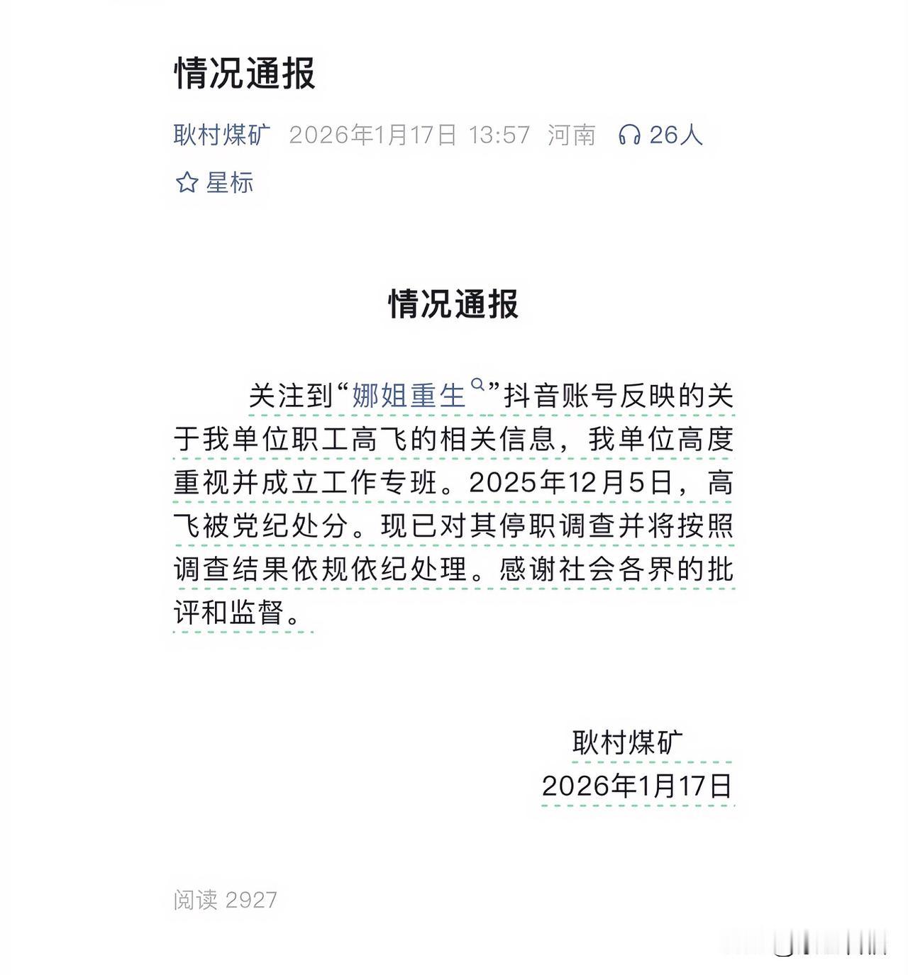 “道歉姐”牛娜发布道歉视频事件最新消息: 其丈夫高飞所在的耿村煤矿发布情况通报。 通过通报我们可以了解到,早在去年12月5日,牛娜的丈夫高飞已经被党纪处分。 目前,单位已经对其进行停职调查并将按照调查结果进行依法依规处理。 对此,大家怎么看?欢迎评论区交流! (图片来源网络)