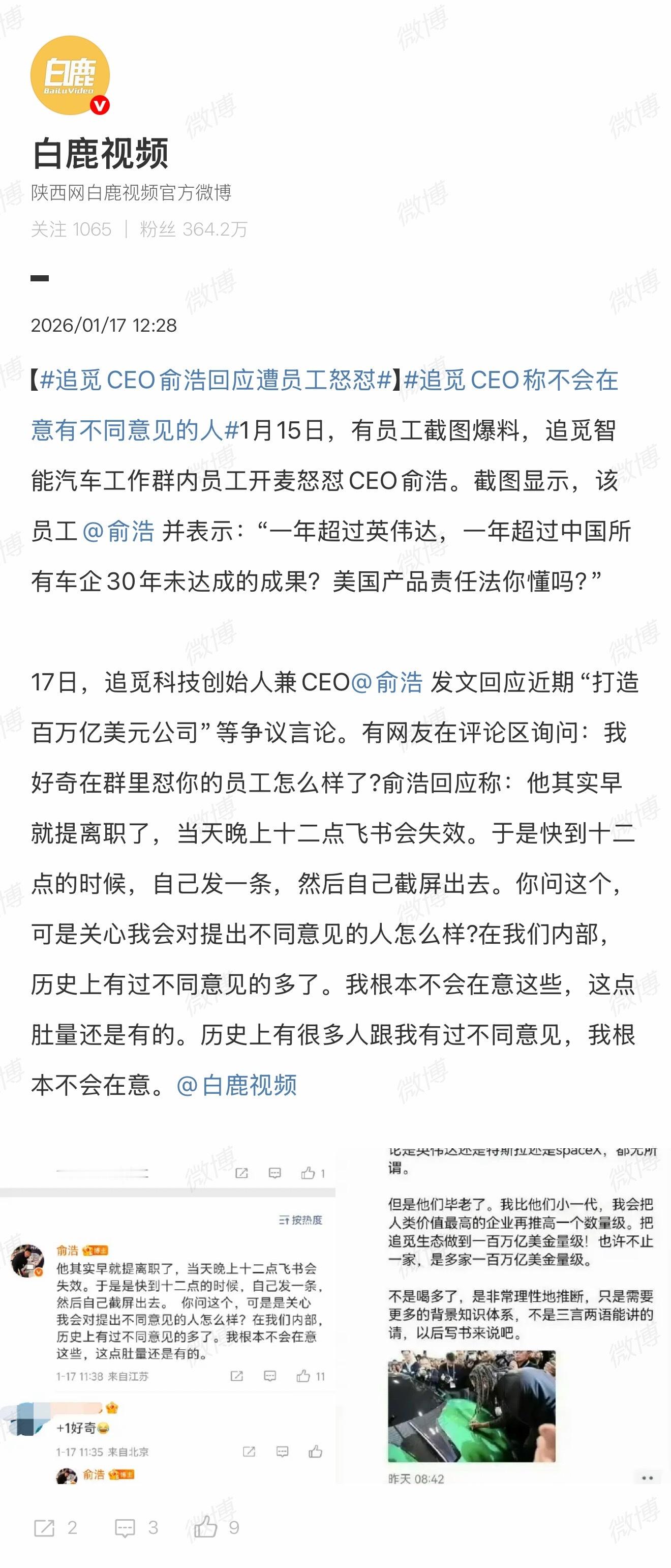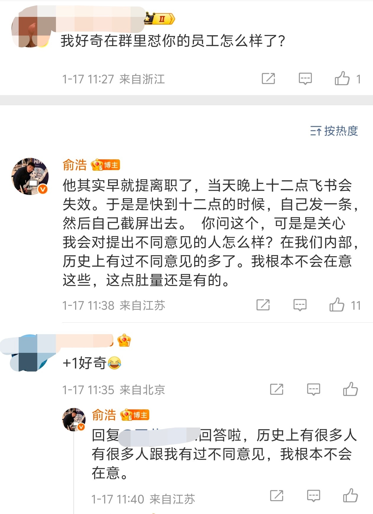 追觅CEO俞浩回应遭员工怒怼当你发现一个员工敢骂老板和领导了,说明他大概率要离职了。追觅CEO俞浩在微博评论区回应怼他的员工的后续,说该员工早就提离职了,在飞书失效前发泄一番。不知道这个员工后续找工作会不会被人问及这件事,毕竟他的名字也曝光了,加上就职公司名字,HR如果知道这件事的话,不难辨别。老张聊科技
