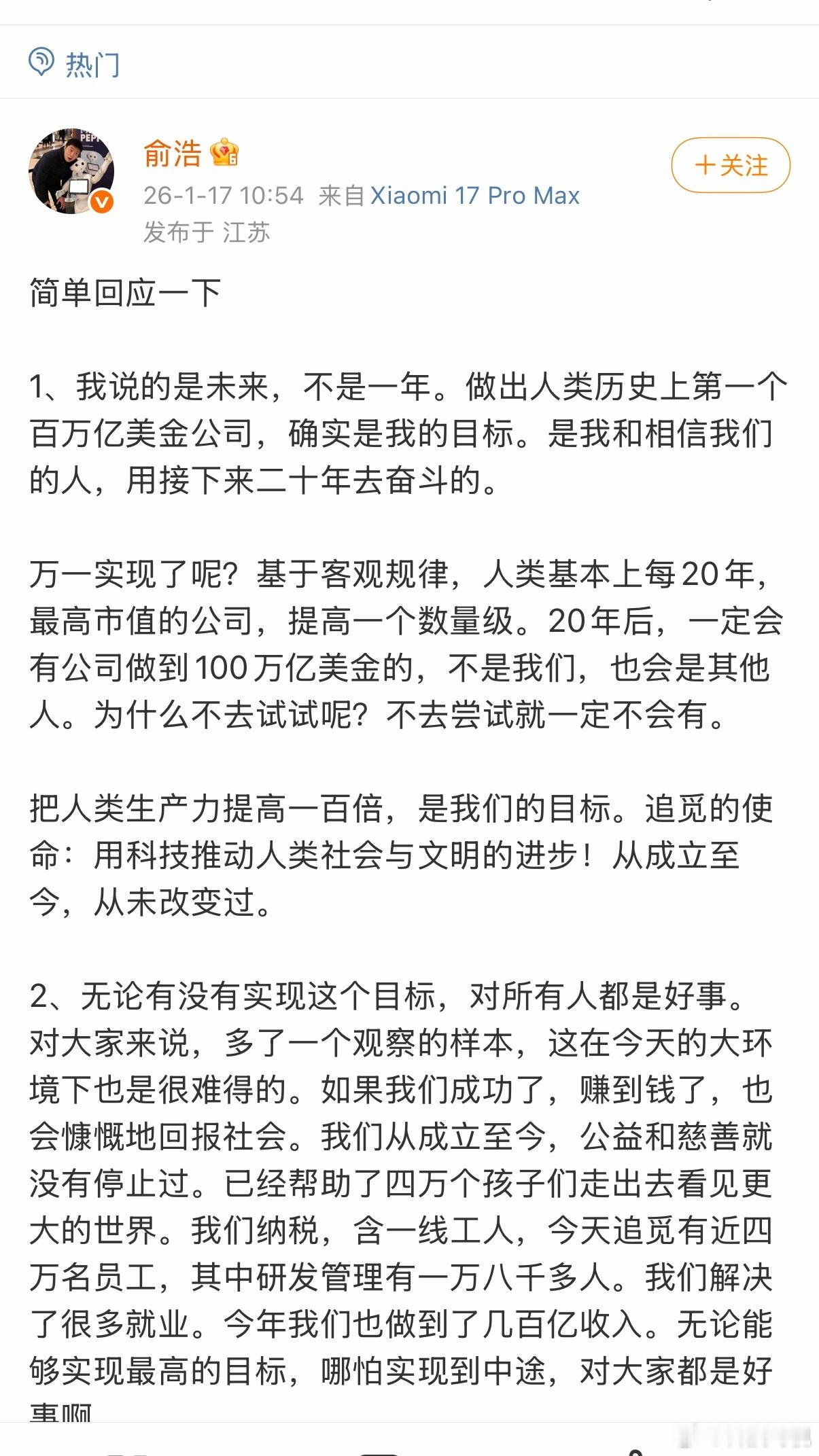 追觅CEO俞浩回应遭员工怒怼看他的回应又觉得他是个挺正常的人,朋友圈里的发言可能