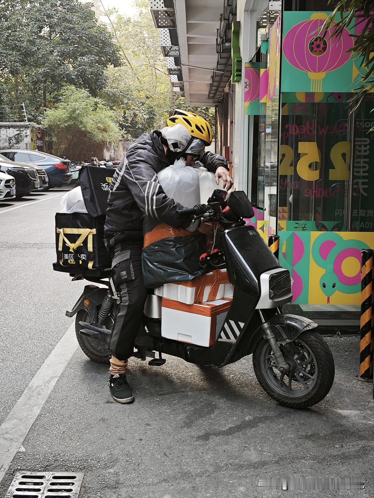 这才是真正的“单王”!外卖小哥的车比货拉拉还能装 今天在街头偶遇一位外卖大哥,直接给我看傻了! 他的电动车堪称“移动仓库”:后座堆着两个美团外卖箱,脚边捆着好几个泡沫箱,胸前还抱着两个鼓鼓囊囊的塑料袋,看那透明袋子里的氧气泡泡,应该是刚捞出来的活鱼。车把被压得直往下沉,他整个人几乎是“嵌”在货物里,只能歪着身子握把。 这哪是送外卖,简直是用小电驴拉货!为了多跑几单多赚点钱,把车用到了极致。看着他小心翼翼挪车的样子,既佩服又心疼——每个为生活拼尽全力的人,都值得被尊重。 不过话说回来,这么多货堆在身上,万一急刹或者被车碰一下,后果不敢想。平台只看配送效率,却没人关心骑手的安全? 💥 争议提问:你觉得,外卖小哥为了多赚钱拼命装货,是平台逼的,还是自己太拼?