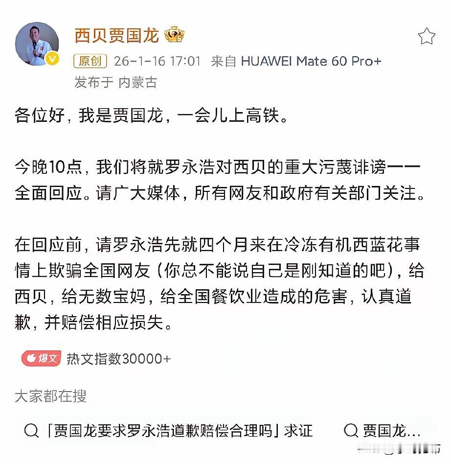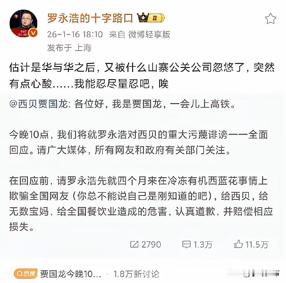 禁言也挡不住了,贾国龙喊话罗永浩:千万别忍! 西贝贾总直接喊话罗永浩:千万别忍,忍不是你性格,也不是我性格。你也别一提自己错的就忍,后面还有很多。 看起来贾总是胸有成竹的样子,面对罗永浩“忍忍算了”的回应,做出了强势回应! 坚信,贾国龙这次是有备而来,非要整出个子丑寅卯出来。对于利用网络网暴企业的就应该这样,痛打落水狗!这回支持贾国龙!