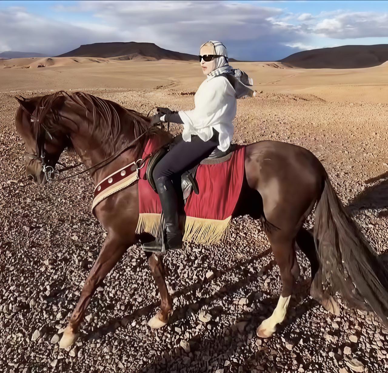 67岁的麦当娜和29岁的男友以及25岁的儿子一起在沙漠中赛马,不忘为伊朗女性发声