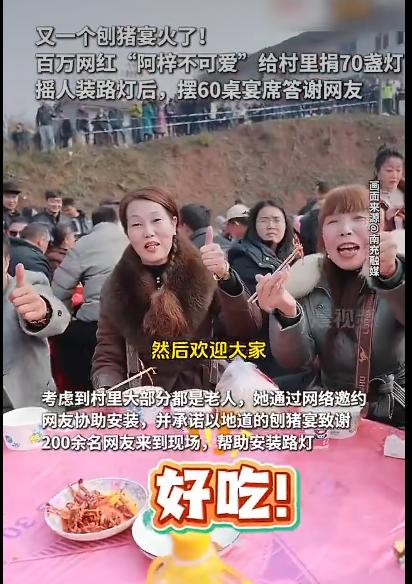 四川有个百万粉丝的网红“阿梓不可爱”干了件暖心事她自掏腰包给老家村子装了70盏太阳能路灯,还摆了60桌“刨汤宴”请全国网友来帮忙安装,这事儿在网上可热闹了。 要说这事儿还得从她返乡说起。“阿梓”是南充嘉陵区曲水镇杜村沟村长大的姑娘,早年在网上靠跳“恶龙咆哮”这类魔性舞蹈走红,后来转型做助农直播。有次她坐两三个小时车去农户家收板栗,帮着卖了几百斤,村民一开始都不信“直播能把货卖出去”。可她硬是带着镜头满山跑,把山里的土货卖到了全国,慢慢成了乡亲们眼里的“带货能手”。 但真正让她下决心捐路灯的,是村里那些摸黑走路的老人和孩子。杜村沟村在丘陵地带,晚上黑得伸手不见五指,老人出门得打手电筒,孩子放学回家总摔跤。有次她看见邻居奶奶端着碗摸黑去串门,差点被石头绊倒,心里就揪着疼:“我小时候也这么走夜路,现在有能力了,得让大伙儿晚上能放心出门。” 她选了不用接电线的太阳能路灯,白天晒太阳,晚上自动亮,既省钱又安全。可安装成了难题村里年轻人大多外出打工,剩下的都是老人小孩,谁也扛不动灯杆、挖不动基坑。这时候“阿梓”灵机一动,在网上发了条视频:“来我老家帮忙装路灯,管吃管喝,还能吃地道刨汤宴!”没想到消息一传开,全国各地的网友都来了——陕西的、新疆的、重庆的,最远的开了十几个小时车,就为了搭把手。 那天村子里可热闹了:200多个网友扛着灯杆、挖着基坑,老人孩子在一旁递水递毛巾;刨汤宴上,刚宰的年猪炖成大锅菜,网友们和村民围坐一桌,边吃边聊;晚上还放了露天电影,组织了拔河比赛,连村里的狗都跟着撒欢儿跑。有位从陕西来的网友说:“我刷到阿梓的视频就来了,没想到能认识这么多朋友,这趟值了!” 这70盏路灯不仅照亮了村道,更点亮了村民的心。有位大妈摸着路灯杆直抹眼泪:“以前晚上不敢出门,现在能去跳广场舞了。”更让人惊喜的是,路灯还成了村里的“致富灯”有村民打算开夜间农家乐,让城里人来体验乡村夜景;还有人想跟着“阿梓”学直播,把山里的土蜂蜜、竹编卖出去。 “阿梓”说,自己走红时粉丝催带货、品牌找代言,她都拒绝了:“先给村里办点实事,比赚多少钱都开心。”现在她直播时连礼物打赏都关了,就想着安安心心做公益。网友们都说:“这才是网红该有的样子,不搞虚头巴脑的炒作,把流量用在实处,既帮了家乡,又温暖了大家。” 这场公益活动最打动人的,是那种“双向奔赴”的温暖网红用影响力为家乡做事,网友用行动支持善意,村民用笑脸回应真心。就像“阿梓”说的:“我淋过雨,现在想给别人撑把伞。”这70盏路灯,照的不仅是乡间小路,更是人心里的光。 来源:潇湘晨报