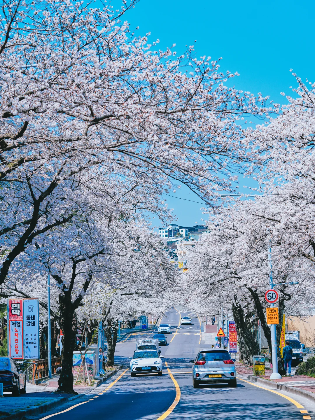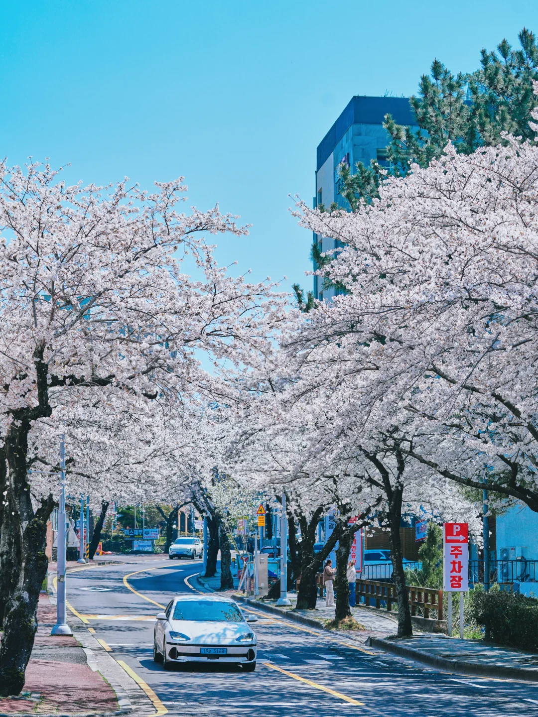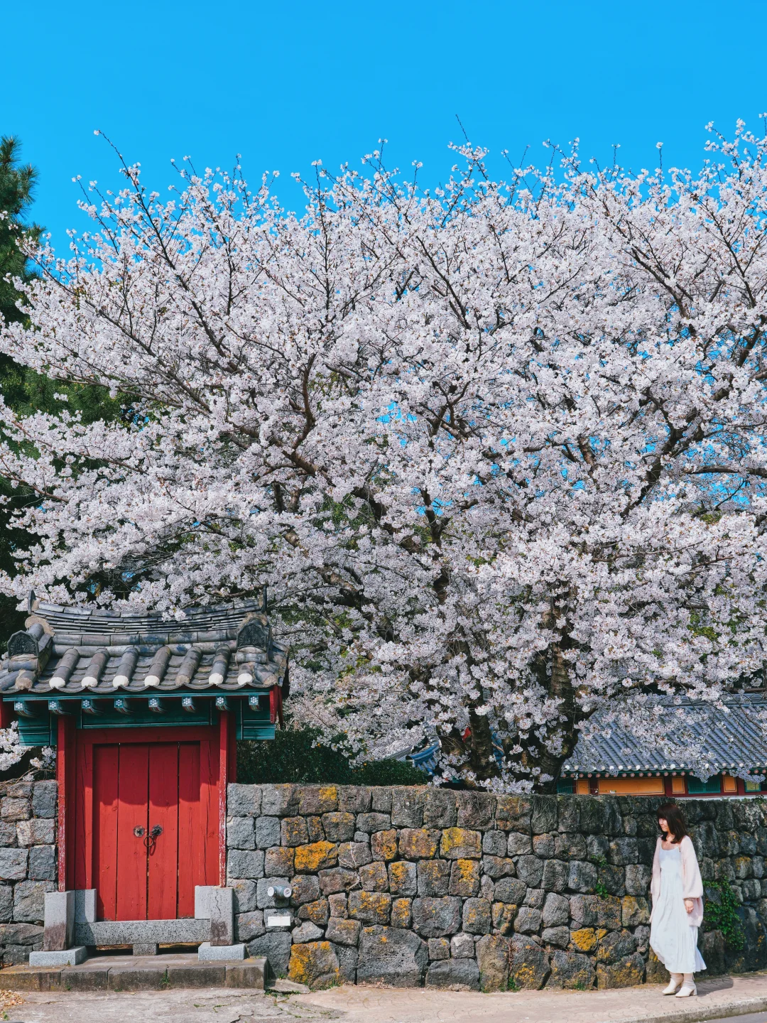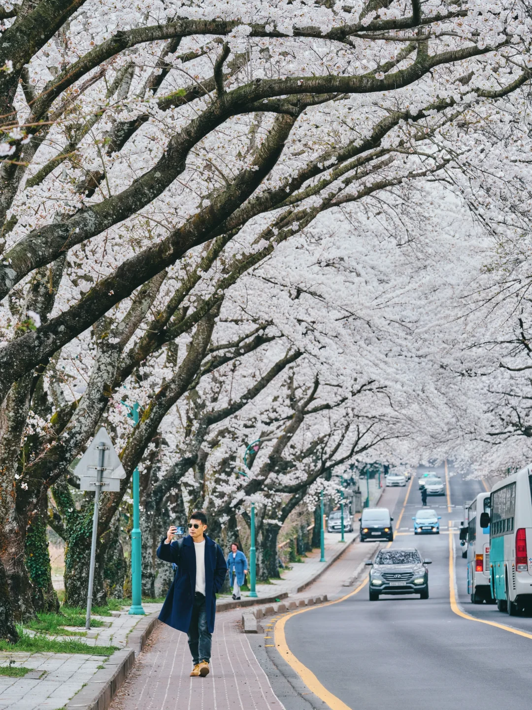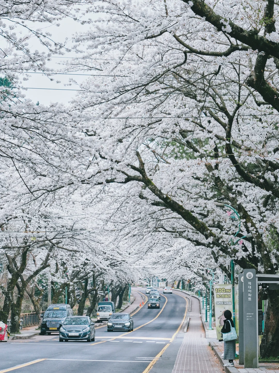 答应我,一定要在春天去一趟济州岛, 漫天飞舞的樱花雨真的美到失语。 - 🌸来济州岛不可错过的5个樱花打卡机位。 1⃣️济州大学(图1、2、3) 校园前的樱花路被称为“济州樱花大道”,樱花几乎盖住了整条马路,非常壮观,尽量赶在早上八点前打卡。 - 2⃣️典农路(图4、5) 全长1.2公里,两侧种满了树龄20-100年的王樱,花瓣大而密集,形成壮观的粉色隧道。 每年还会举办樱花节,晚上有灯光秀,氛围感超棒。 - 3⃣️三姓穴(图6、7) 庭院内有两株古樱花枝繁花茂,配合韩式古建筑,很适合拍韩服写真。 - 4⃣️新山公园(图8、9) 公园很大,樱花非常密集,有溪谷、篮球架、小桥等不同场景,拍照很出片,野餐也很惬意。 - 5⃣️西归浦 导航“제주 서귀포시 호근서호로 99”,跟典农路很像,很长的樱花路,不过这里很少有游客,很文艺、幽静、更生活。