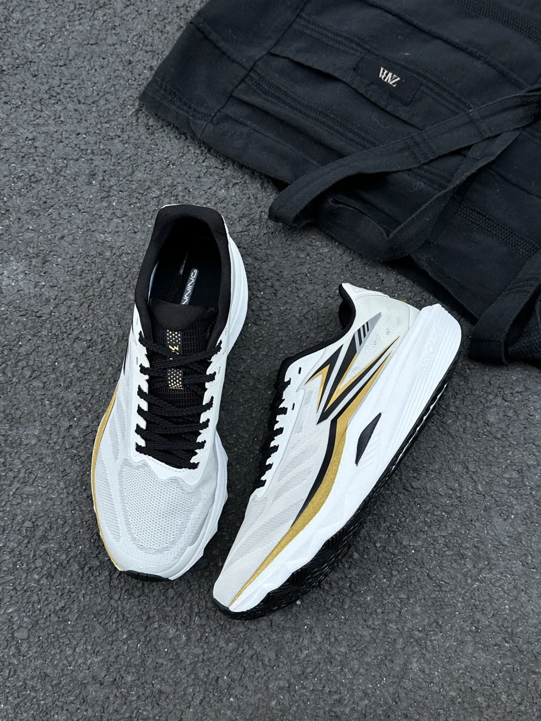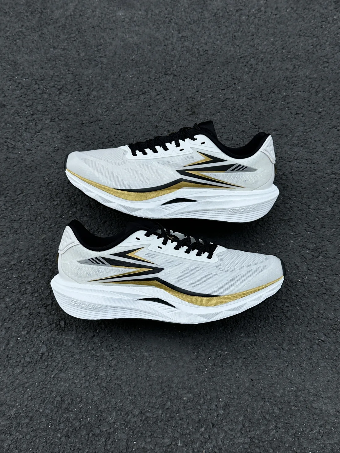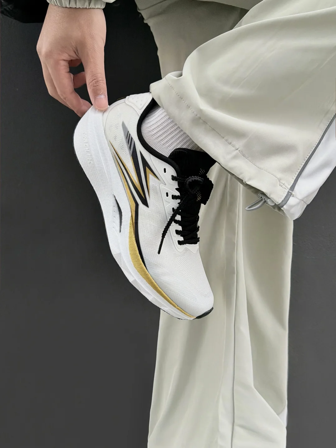 今天分享361°的赛道小强,白鞋身配黑金竞速线条,流线型鞋身是专业跑鞋的设计感,鞋侧的棱角装饰模拟赛道冲刺的速度感,网面鞋面做了透气导流纹赛道鞋的经典细节设计。 上脚搭浅灰机能裤超适配,宽松裤腿刚好露出鞋型的竞速线条,运动感和街头感平衡得超棒;配黑色运动短裤的话,又能突出鞋子的赛道属性,日常穿或轻慢跑都合适,百元价位能get专业赛道鞋的颜值和性能,太香了!