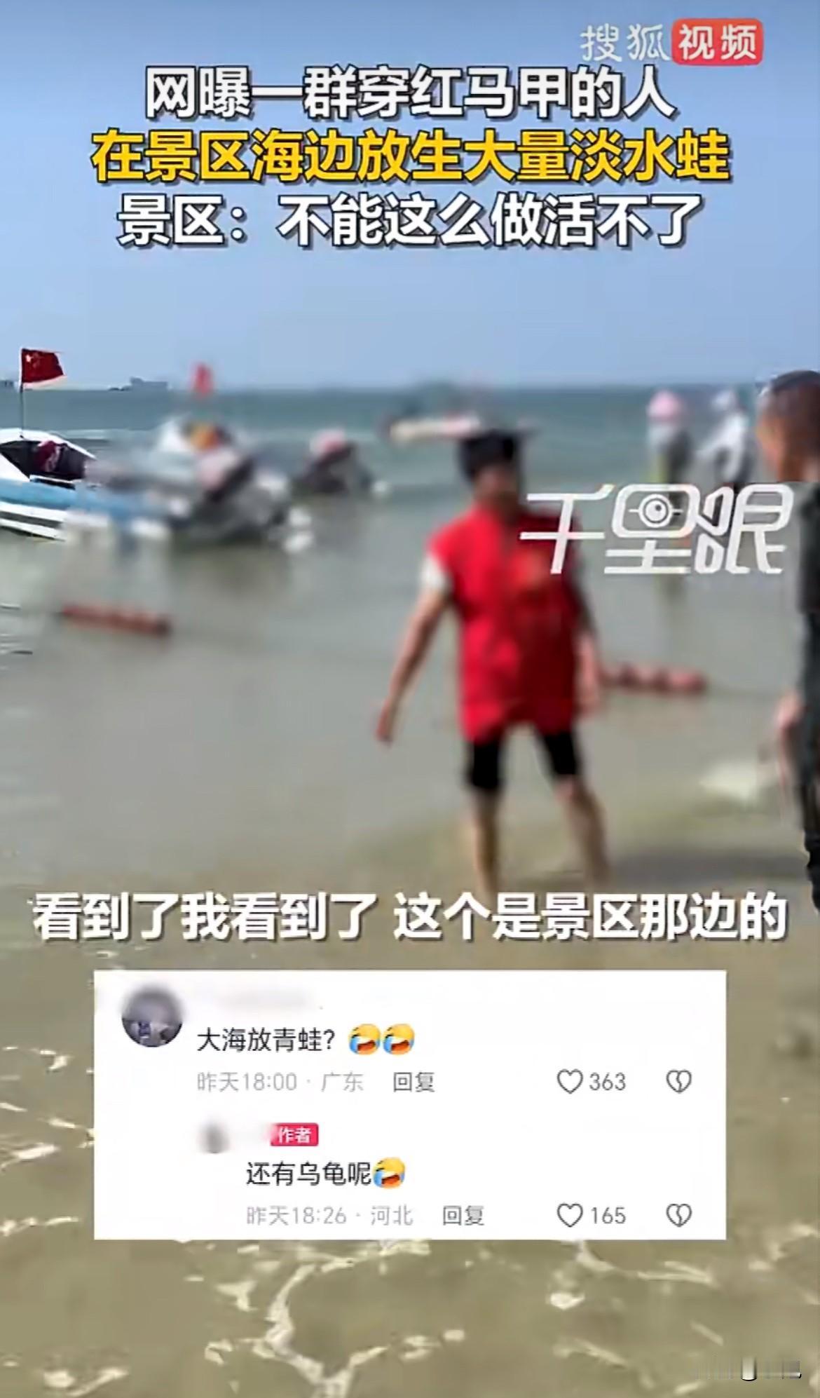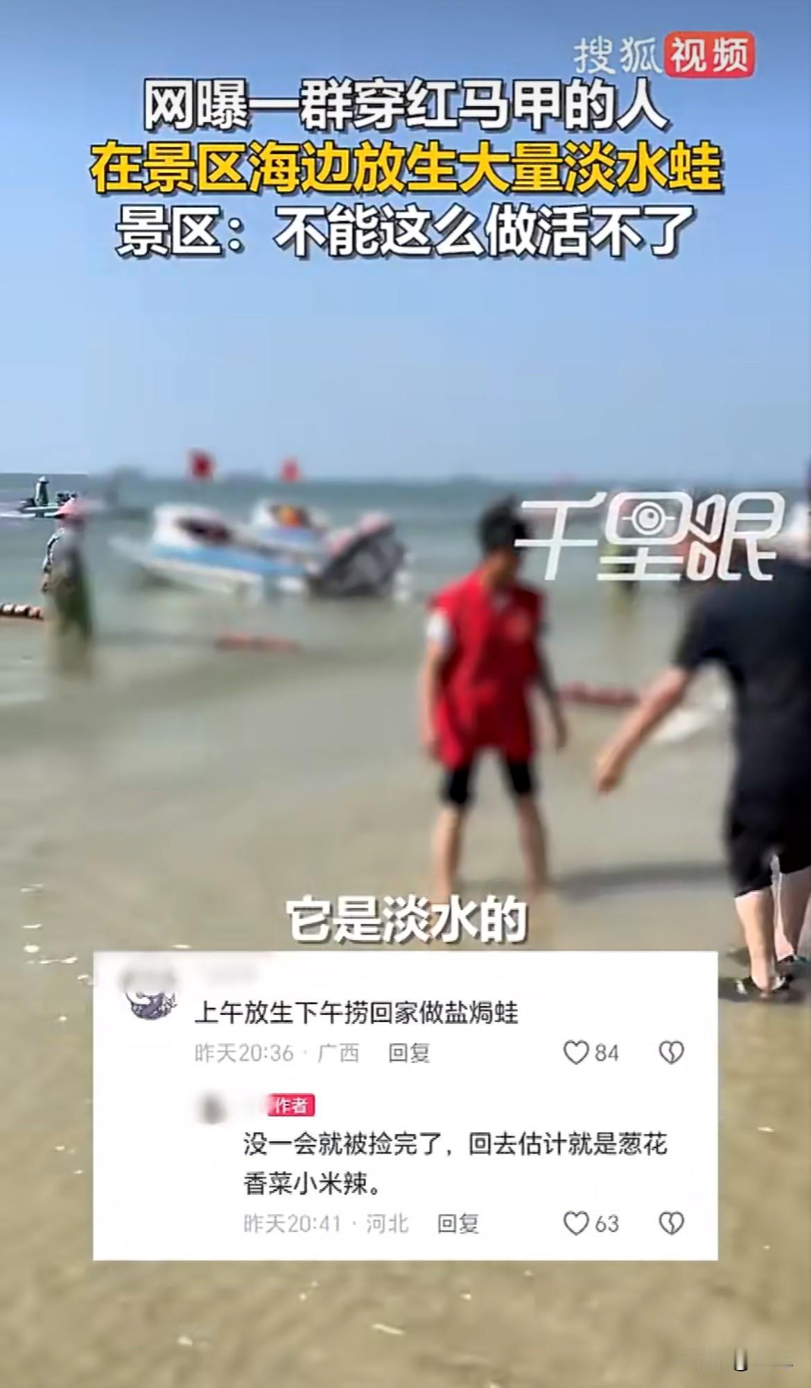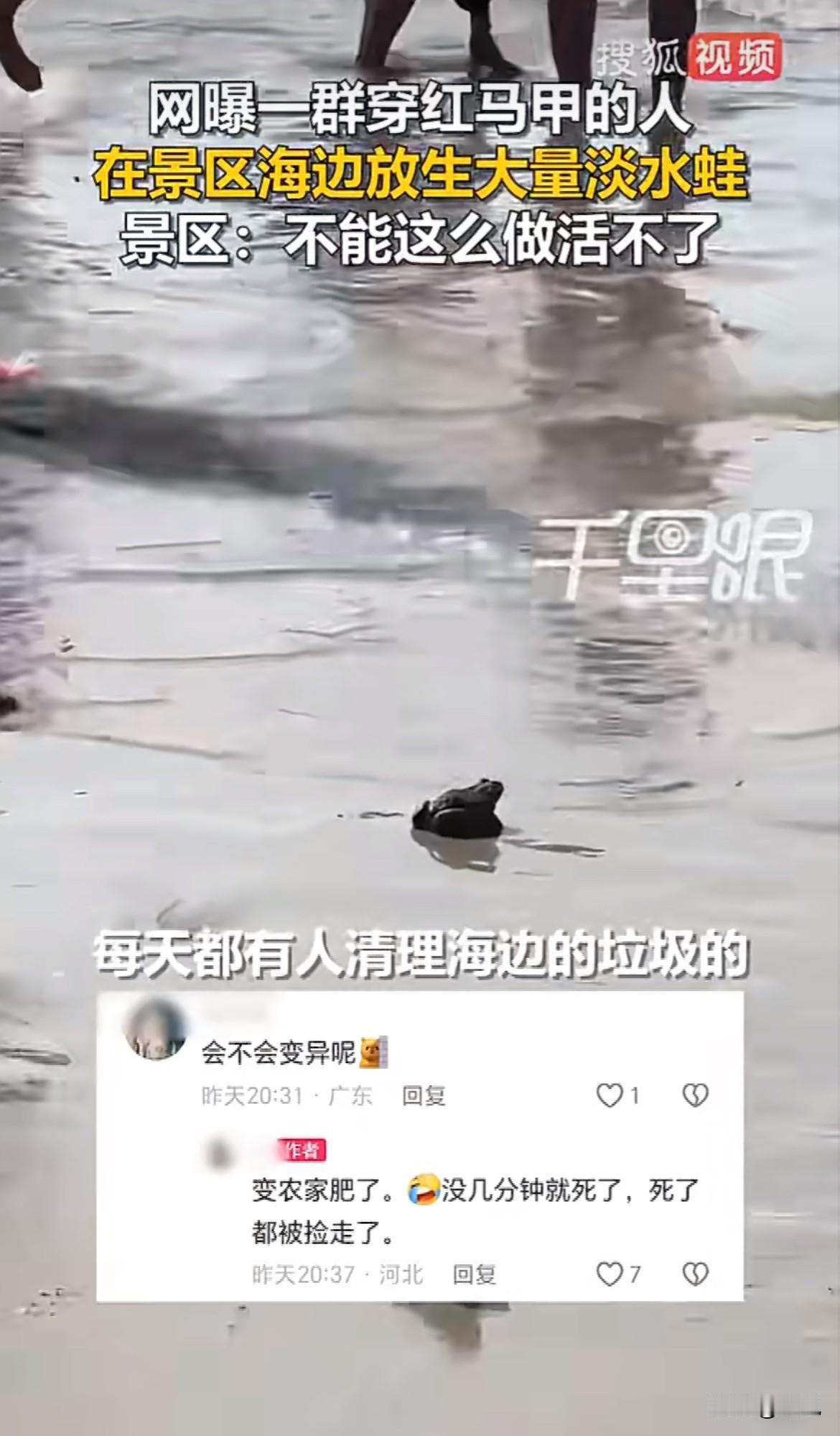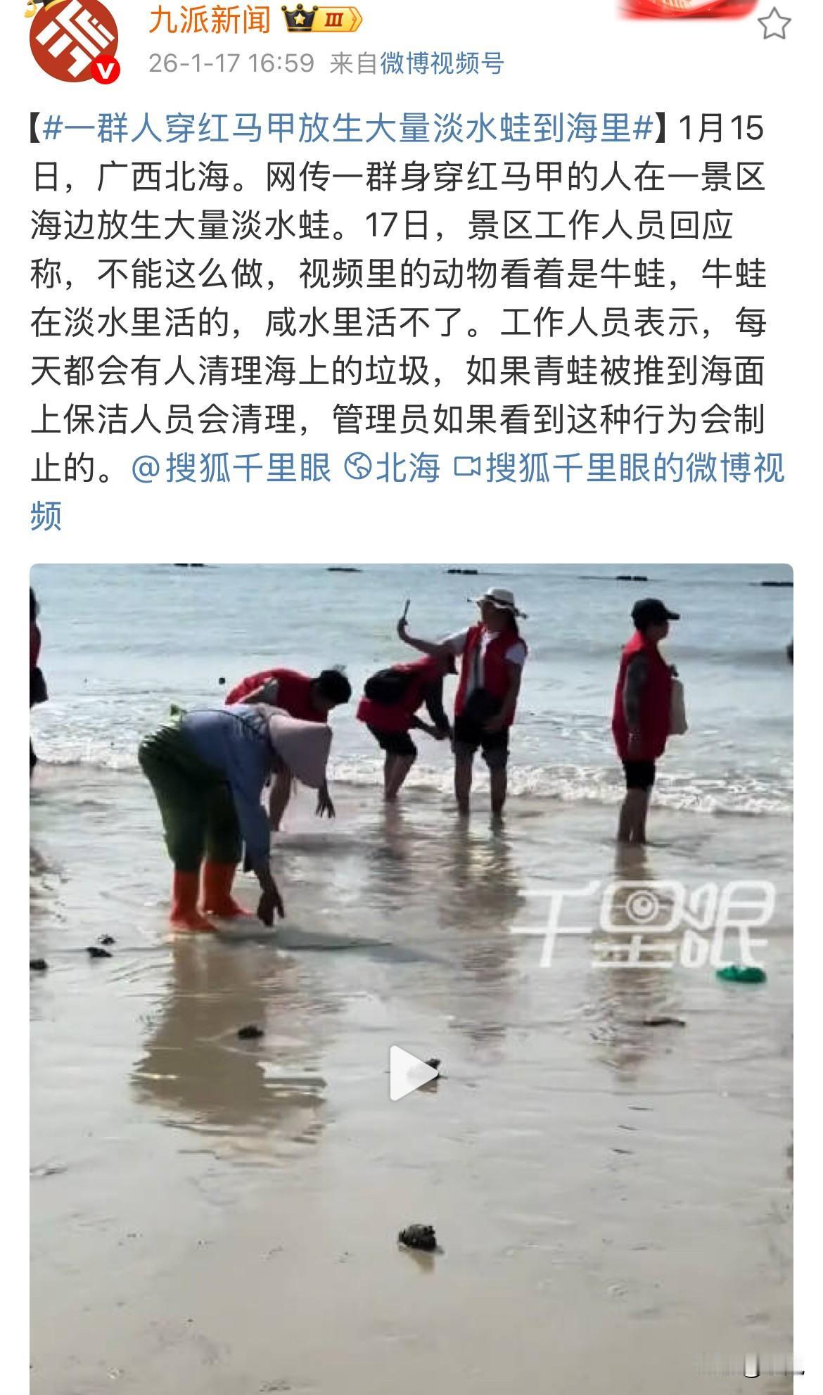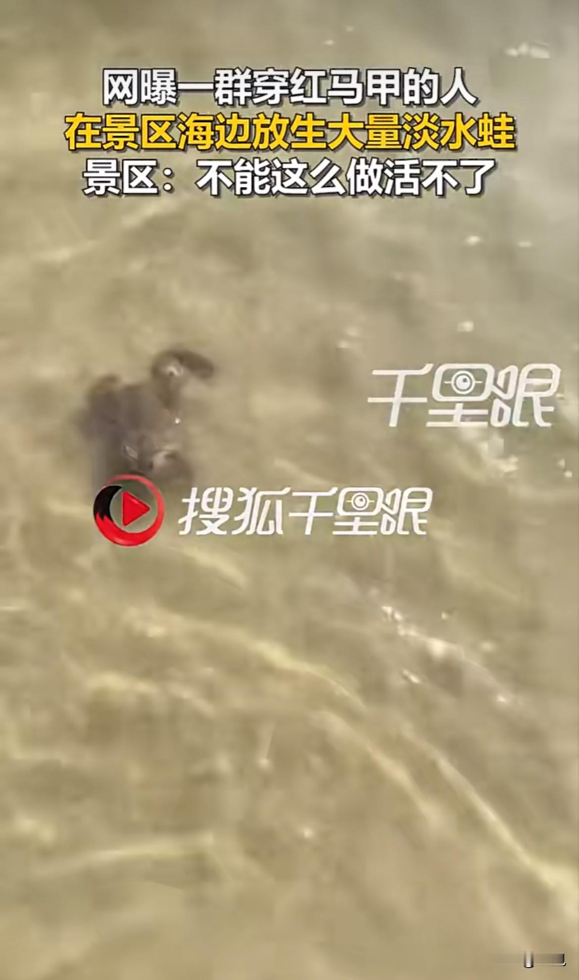 广西北海这波操作太“迷”了!一群穿红马甲的人往海里狂放淡水蛙,景区急得直喊:“这蛙活不了啊!” 1月15号,广西北海一景区海边,一群穿红马甲的人往海里扔了好多淡水蛙。17号景区工作人员出来说,视频里的是牛蛙,牛蛙是淡水动物,在咸海水里根本活不下去。 这哪是放生,明明是“杀生式放生”!想做善事也得先搞清楚动物习性吧,淡水蛙扔海里,这不就是把它们往死路上送吗?而且景区每天都有保洁清理海边垃圾,管理员看到这种操作也会制止。 你说这“放生”是不是纯纯瞎折腾?在我看来,放生不是形式主义,得先搞明白物种适合的环境,不然好心办坏事,既没帮到动物还可能破坏生态,这种“伪善”还不如不做呢!你怎么看这事?