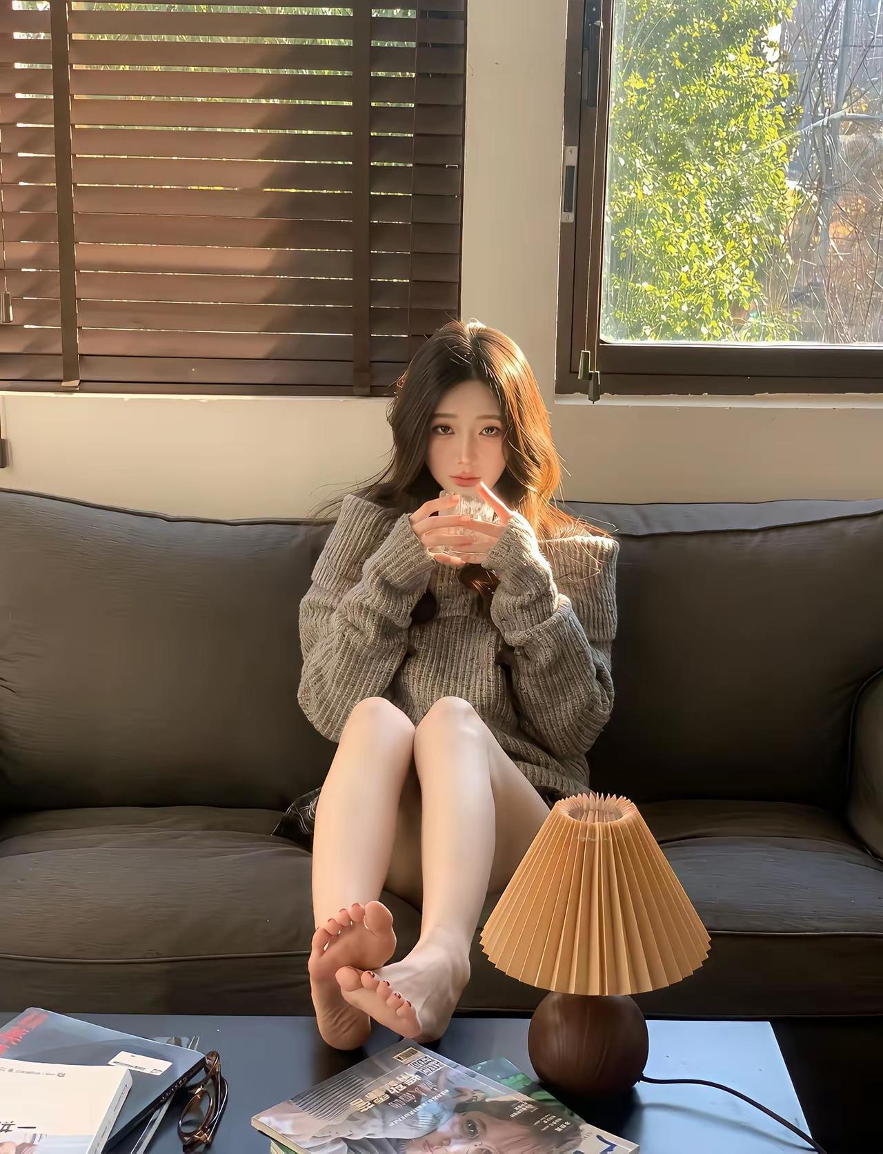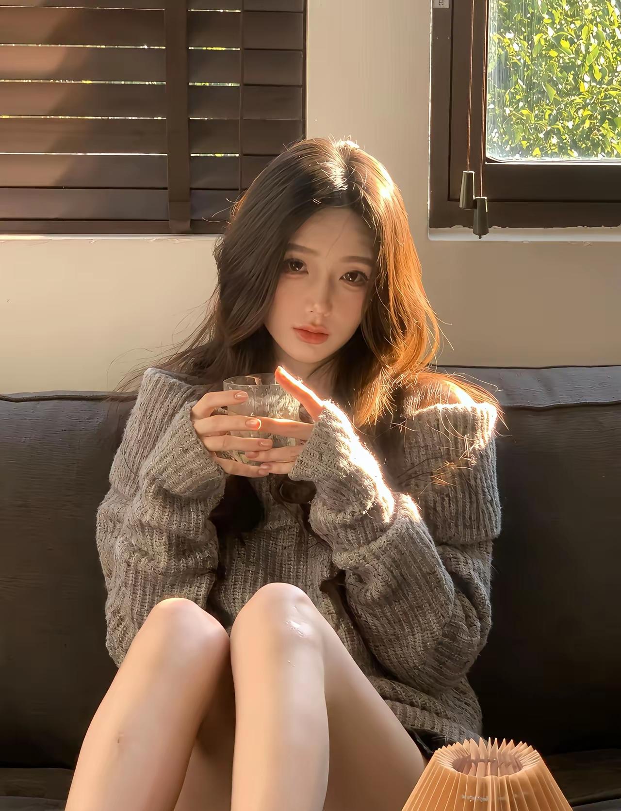 慵懒午后,阳光洒落,少女轻啜香茗,享受宁静时光。知性美女穿搭分享 分享高跟鞋的穿