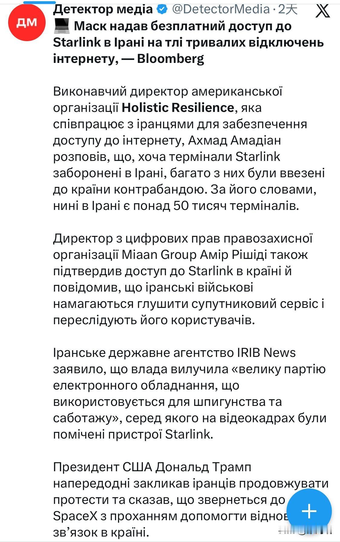 据彭博社报道,在伊朗互联网长期中断期间,马斯克向伊朗免费提供了星链服务。 总部位于美国的“整体韧性”(Holistic Resilience)组织执行主任艾哈迈德·阿马迪安表示,尽管星链终端在伊朗被禁,但仍有许多终端被走私入境。该组织致力于帮助伊朗民众获得互联网接入。他指出,目前伊朗境内已有超过5万个星链终端。 人权组织 Miaan Group 的数字权利主管 Amir Rishidi 也证实了该国可以访问 Starlink,并表示伊朗军方正试图干扰该卫星服务并骚扰其用户。 伊朗官方通讯社IRIB称,当局查获了“大量用于间谍活动和破坏活动的电子设备”,视频画面中出现了星链设备。 美国总统唐纳德·特朗普前一天呼吁伊朗民众继续抗议,并表示他将请求SpaceX公司帮助恢复该国的通信。